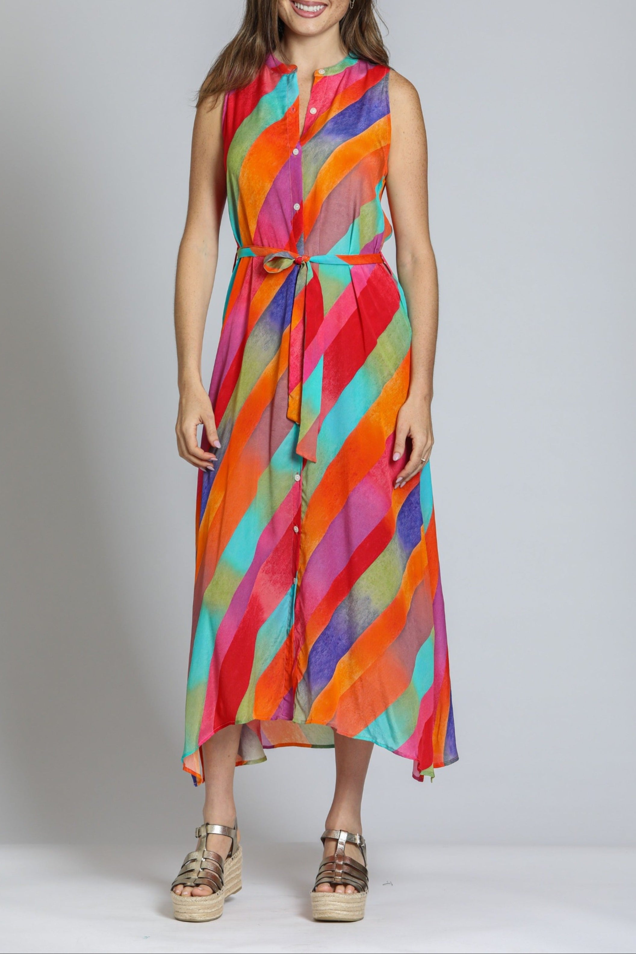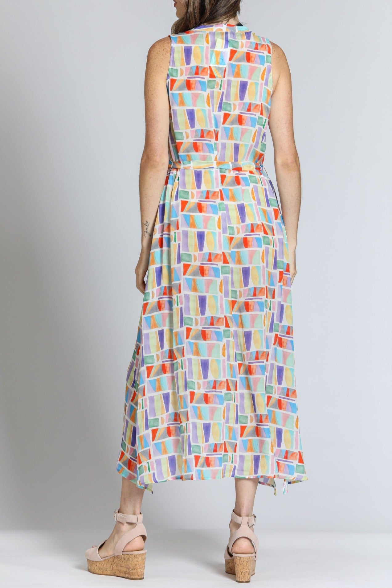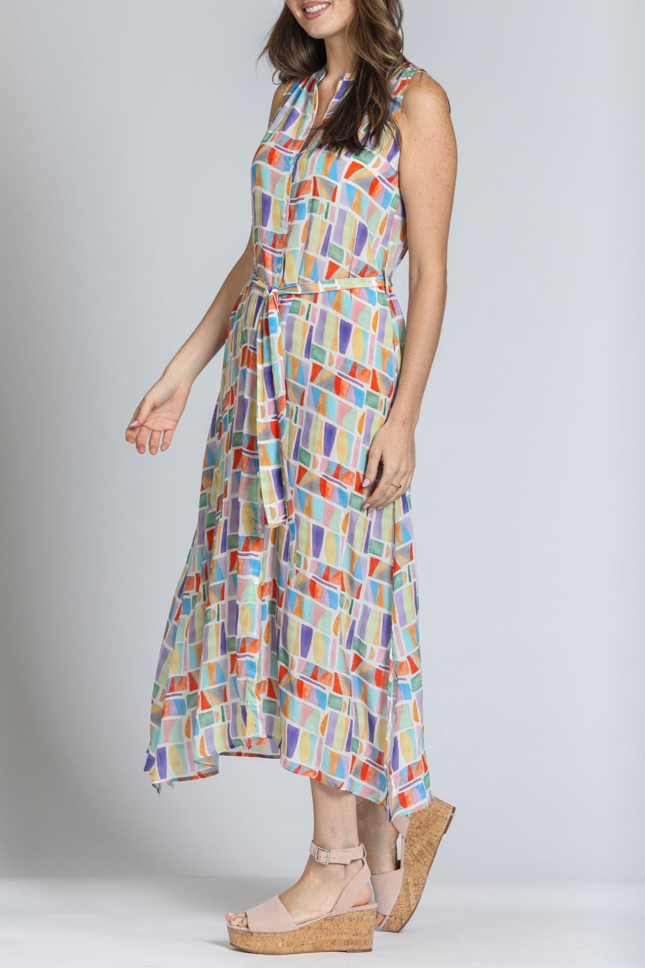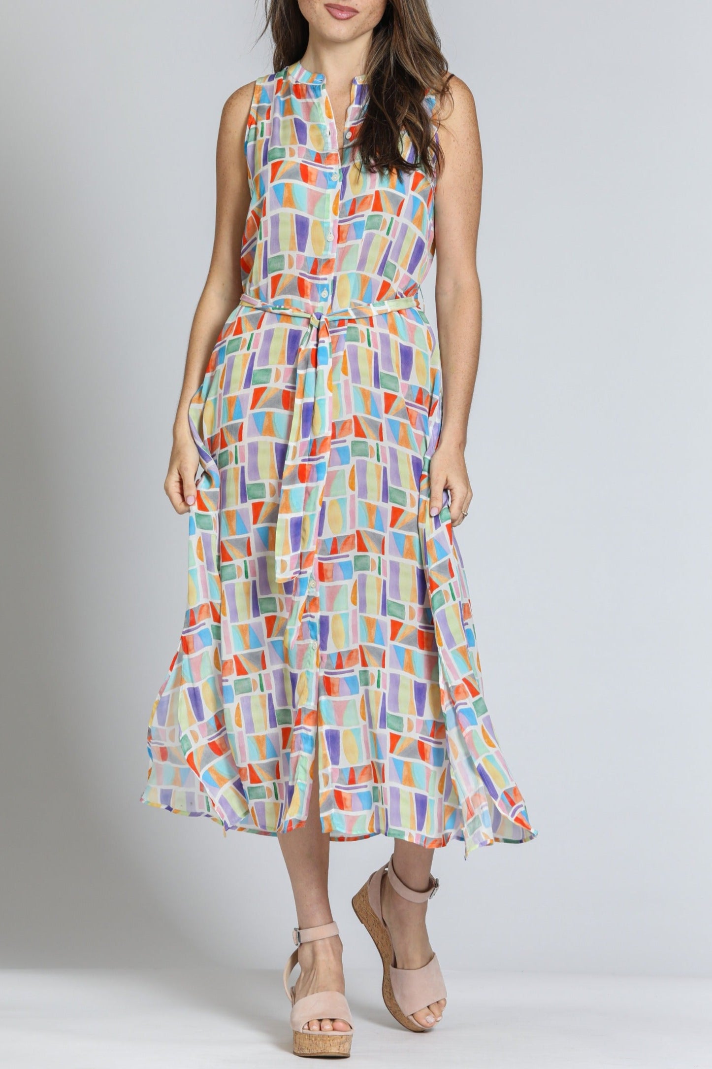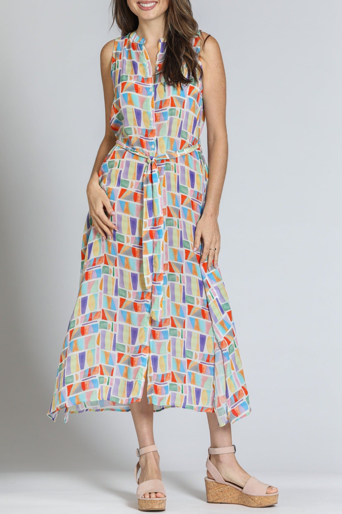 This sleeveless maxi dress features a vibrant geometric print in pastel hues, perfect for a breezy, modern look. Designed with a button-down front and a matching fabric belt, it flatters the silhouette effortlessly. The lightweight, flowy fabric adds movement and comfort, making it ideal for warm-weather outings. Pair it with wedges or sandals for a chic, casual ensemble.