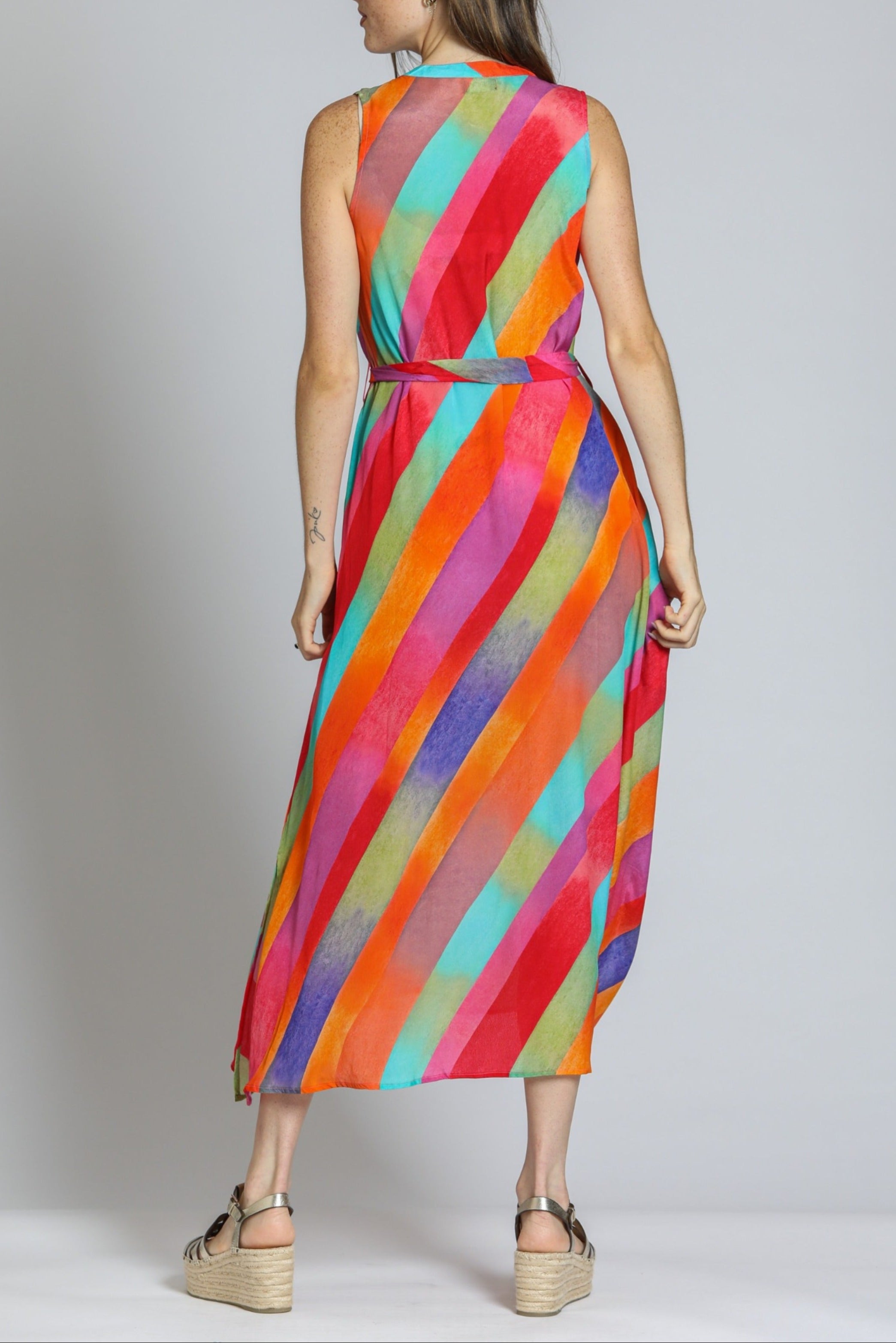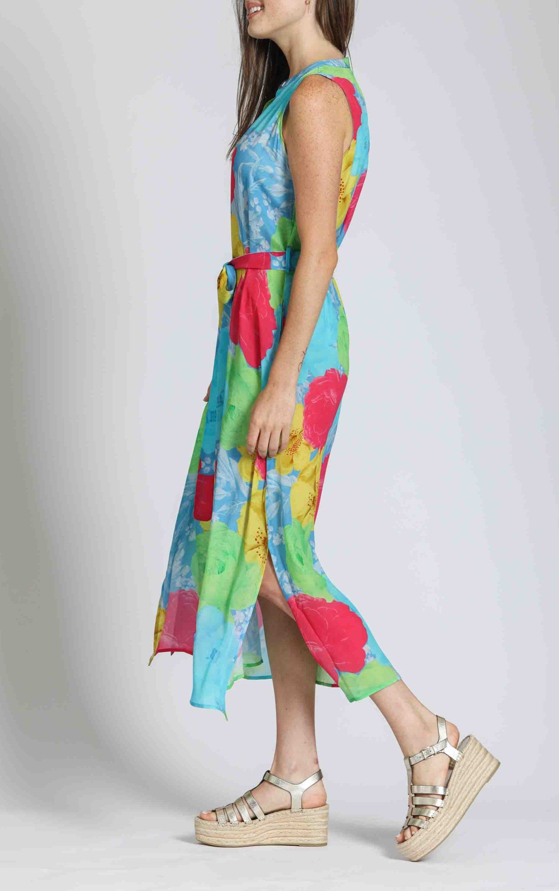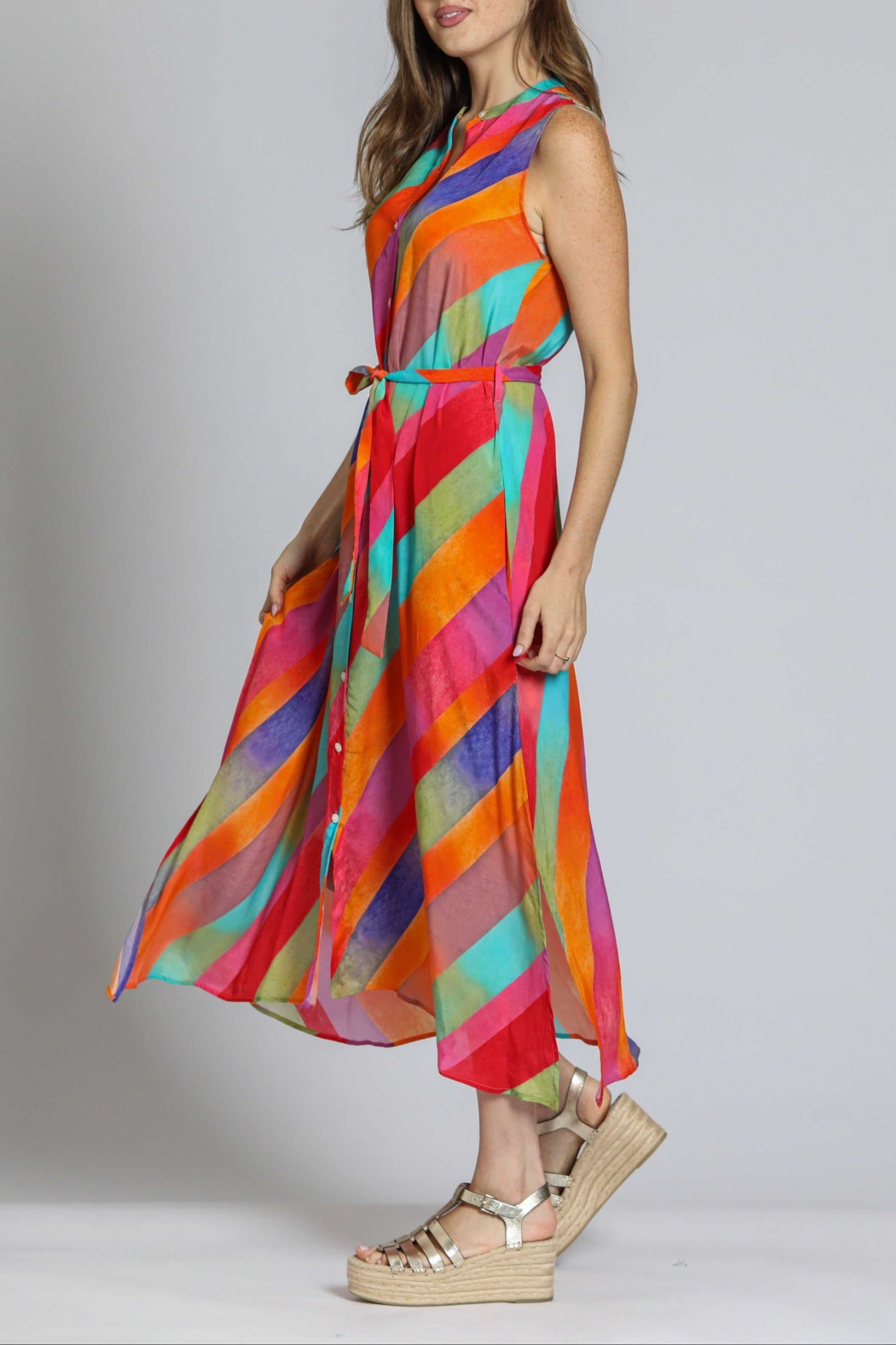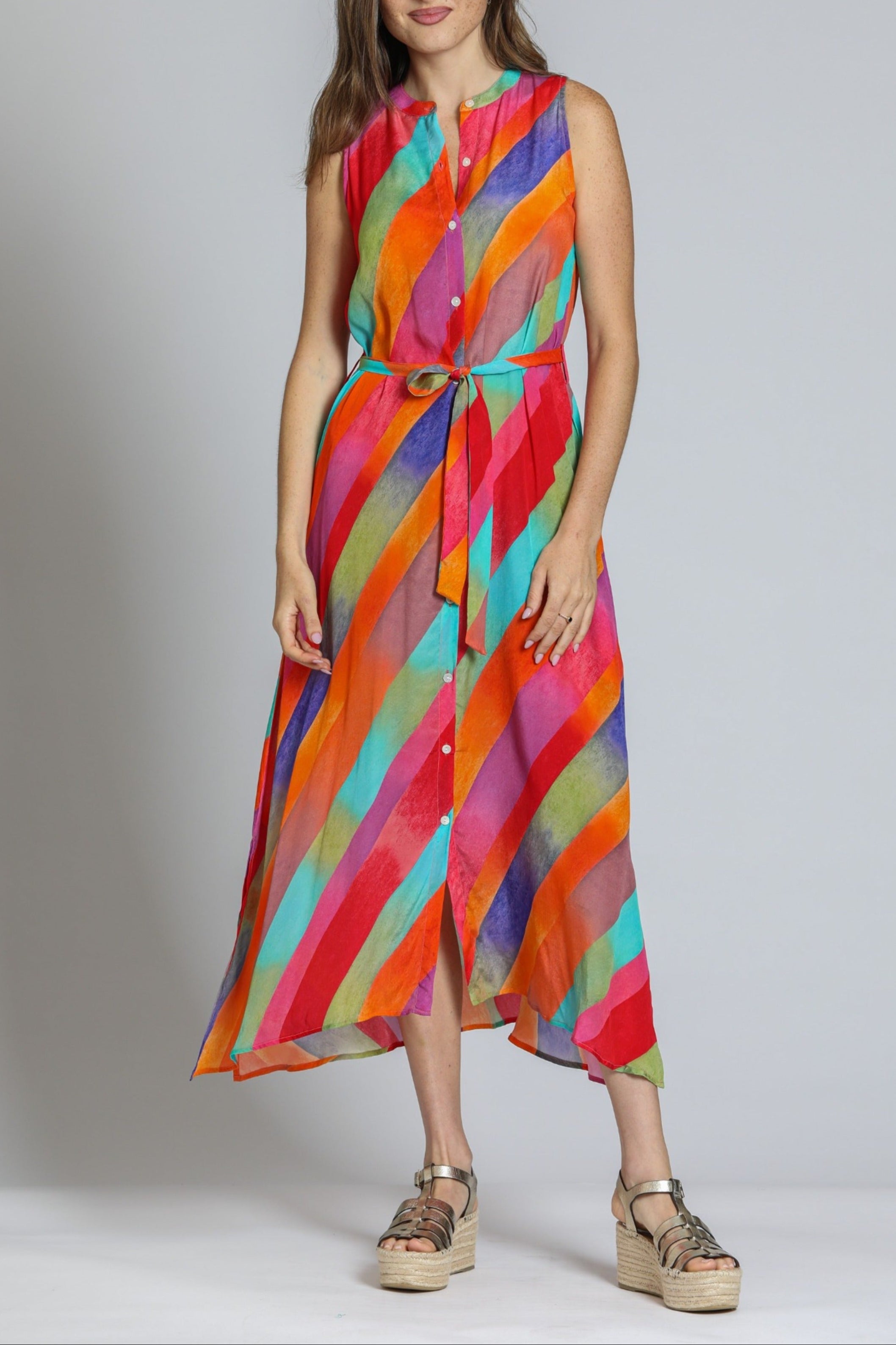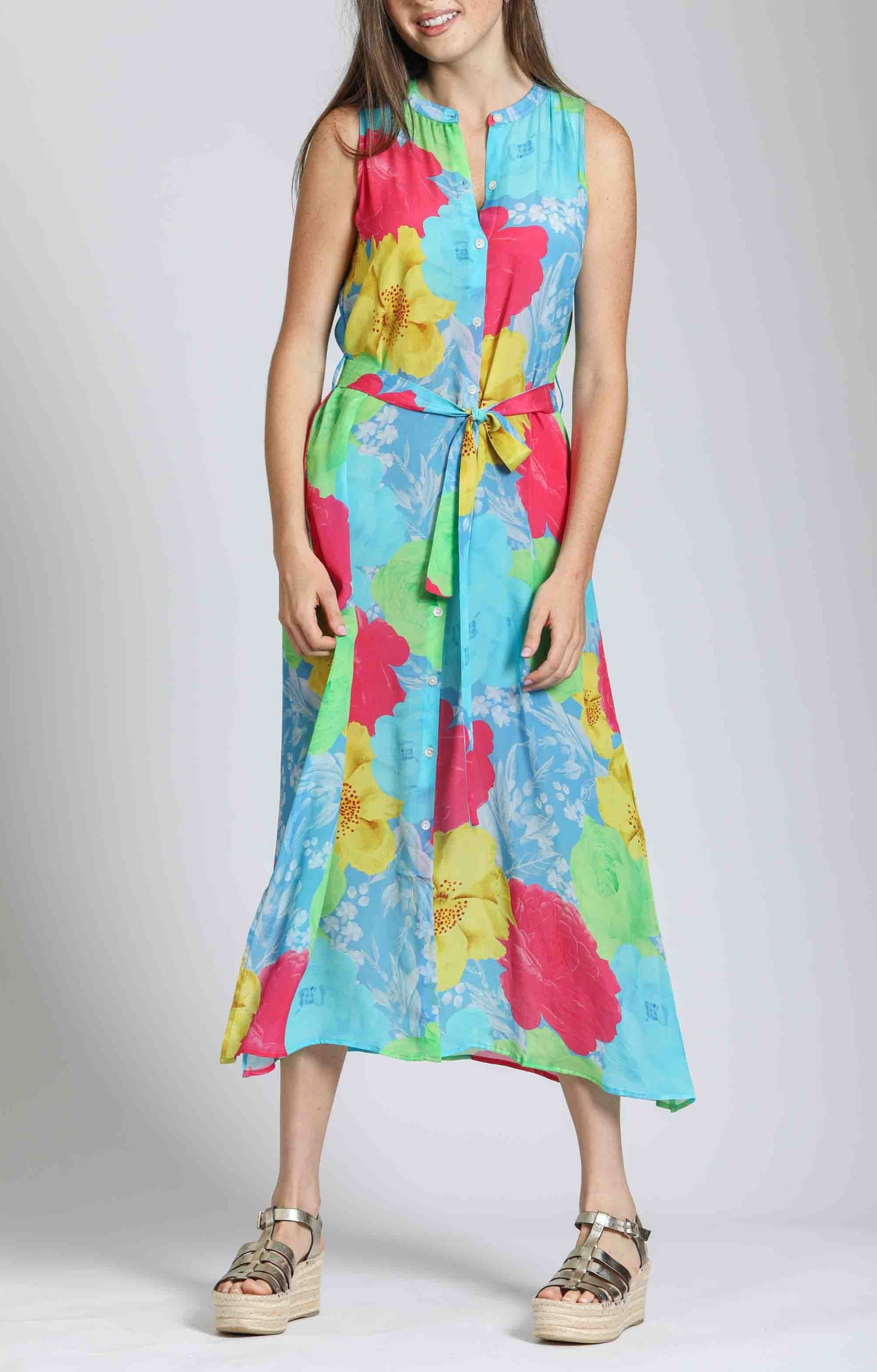 This sleeveless maxi dress features a vibrant geometric print in pastel hues, perfect for a breezy, modern look. Designed with a button-down front and a matching fabric belt, it flatters the silhouette effortlessly. The lightweight, flowy fabric adds movement and comfort, making it ideal for warm-weather outings. Pair it with wedges or sandals for a chic, casual ensemble.
