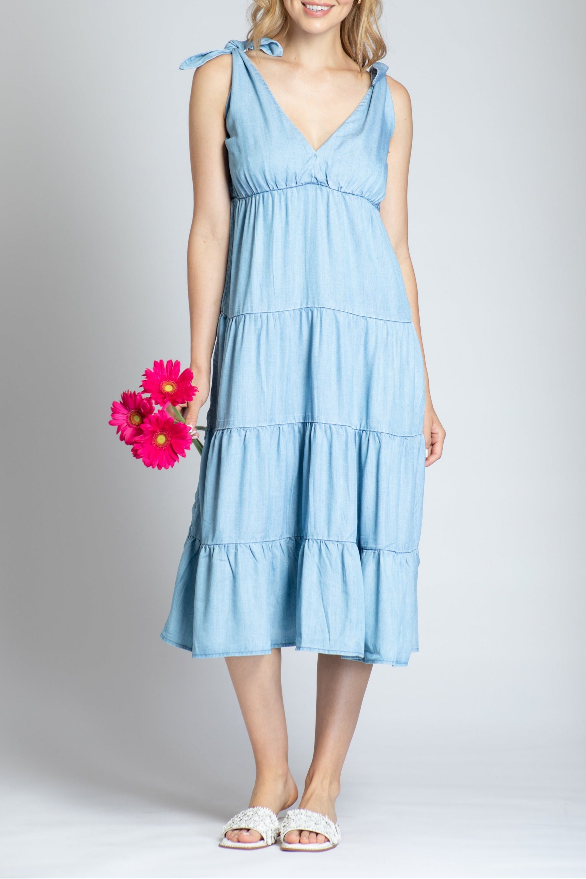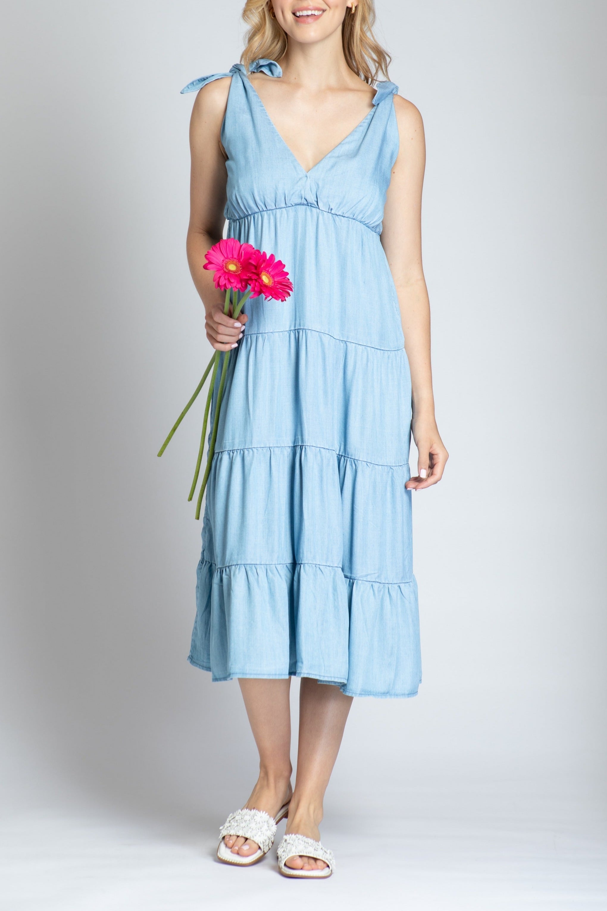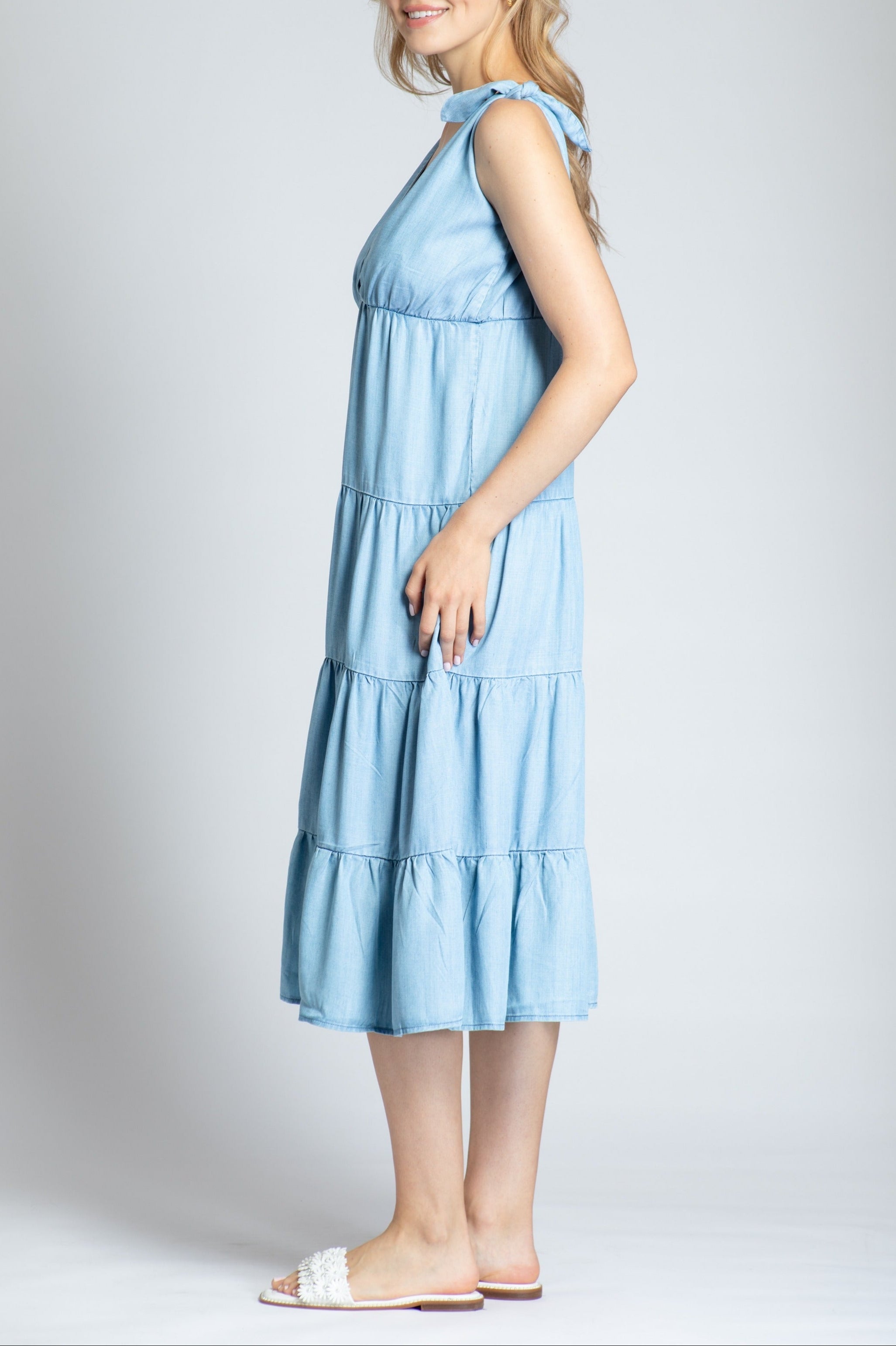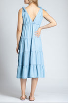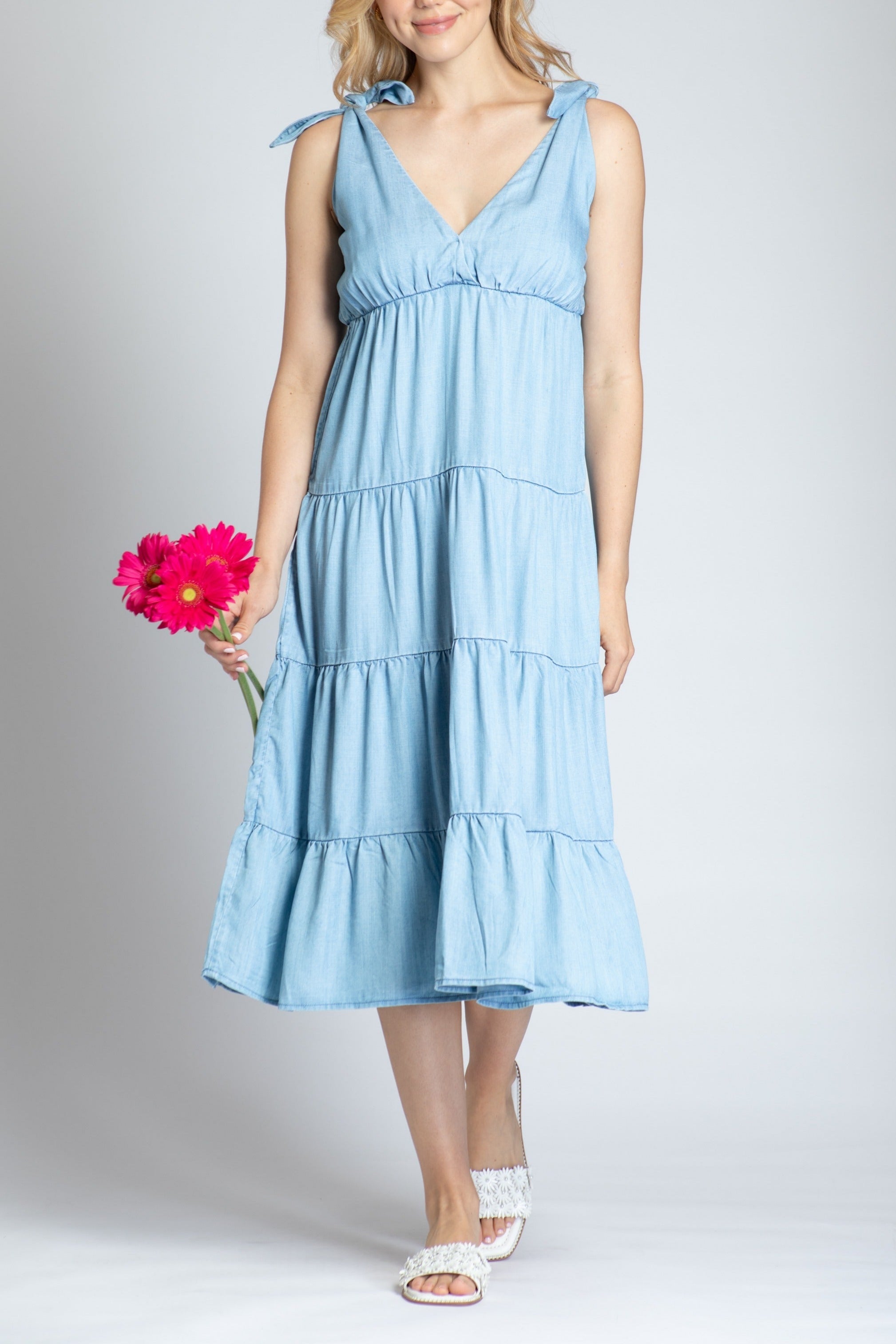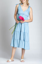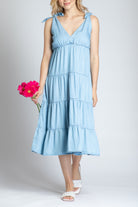 This dress is a soft blue, like a clear sky on a spring day. The tie-knot details at the shoulders add a playful touch, and without sleeves, it's perfect for staying cool. The dress flows out to a flared hem at midi length, giving it a relaxed and comfortable fit. It's made of 100% Tencel, so it feels as breezy as it looks—ideal for sunny days or a casual outing.