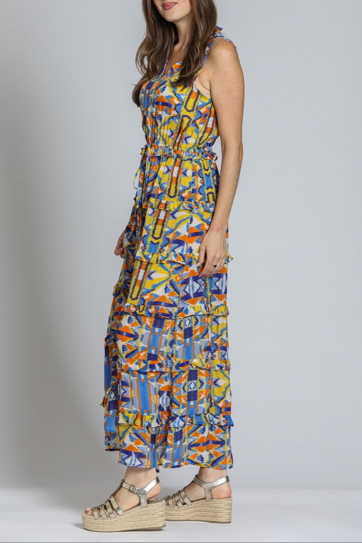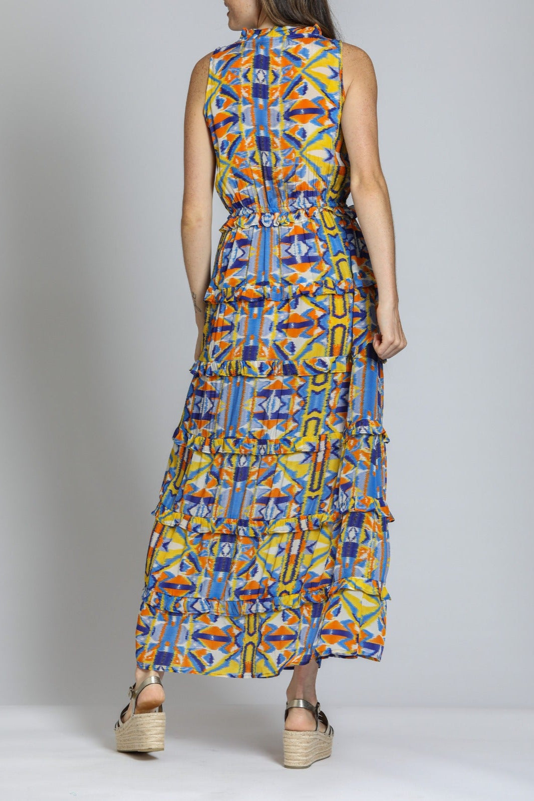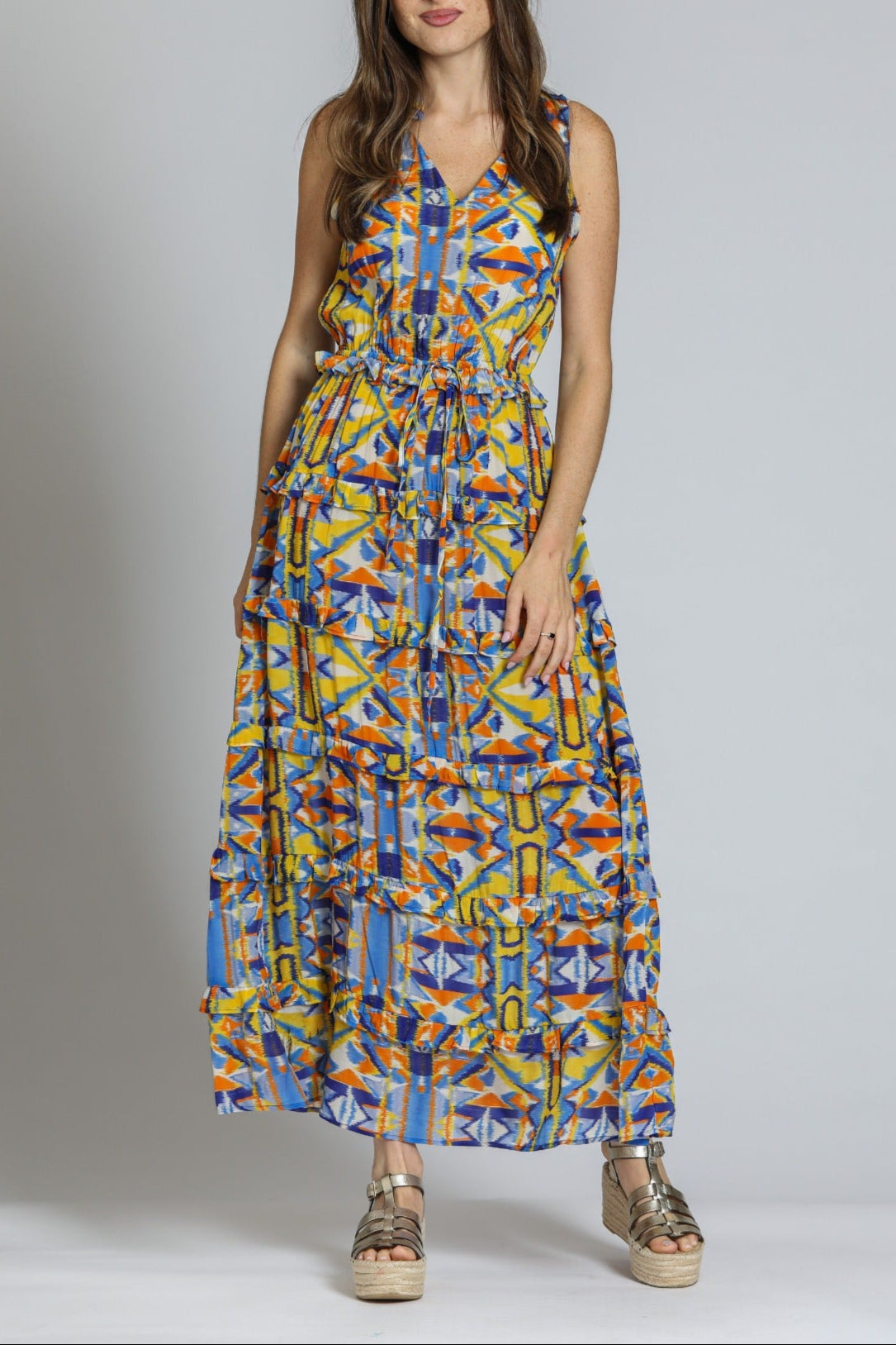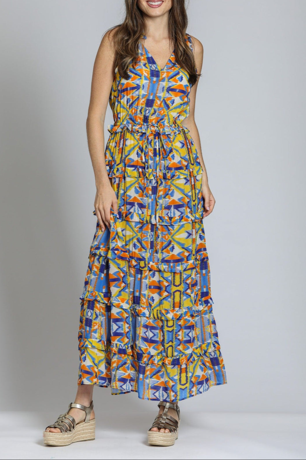 Make a statement in this vibrant sleeveless maxi dress, featuring a bold geometric print in eye-catching hues. Designed with a drawstring waist and tiered skirt, this dress offers a flattering fit and breezy movement, perfect for vacation, brunch, or summer outings.