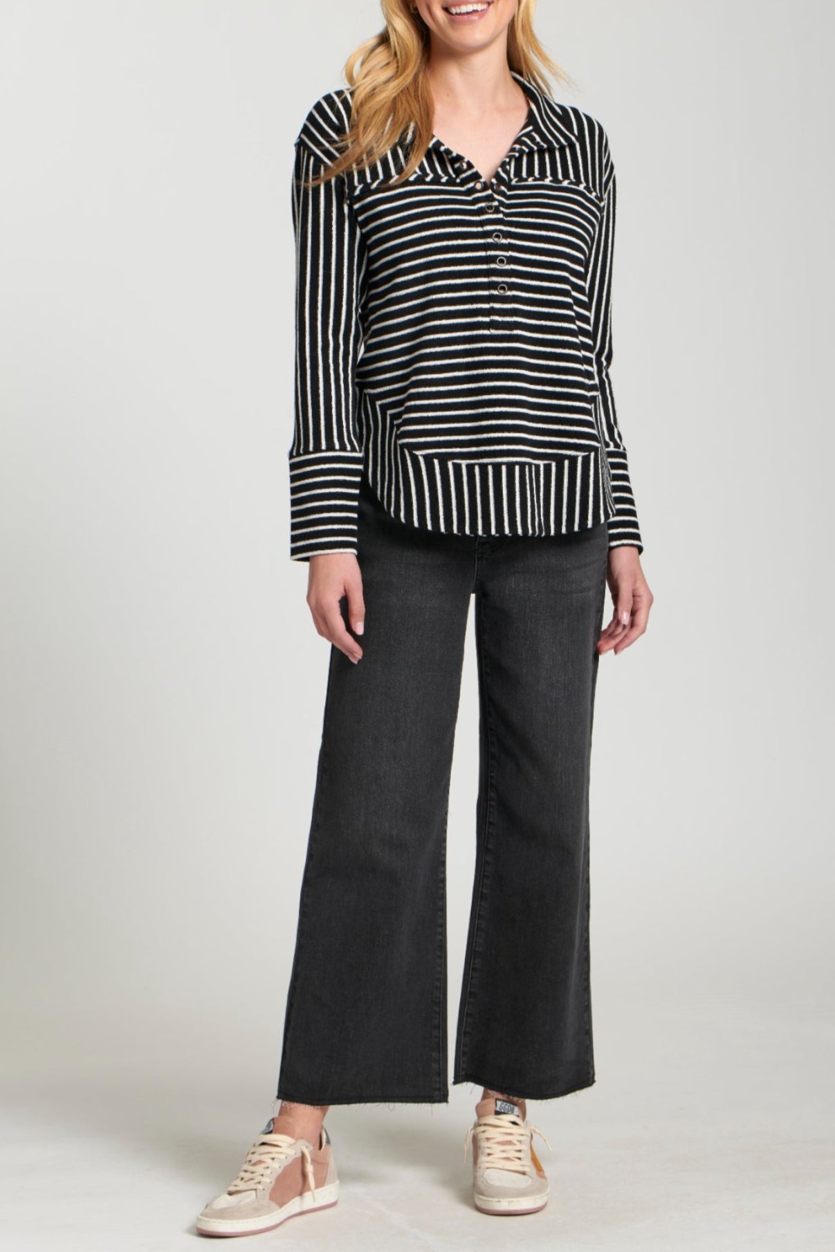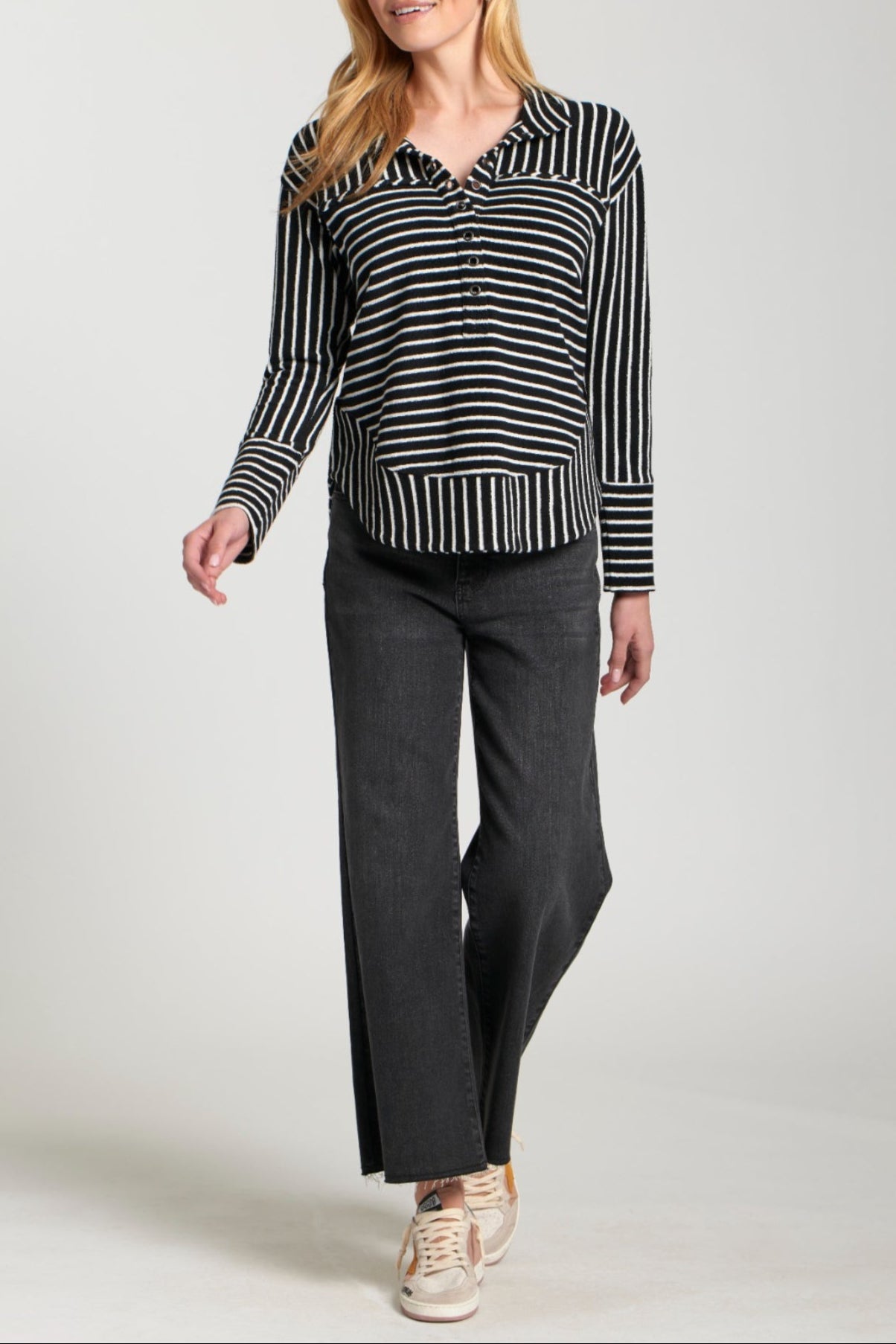 Make a stylish statement with our Spliced Stripe Henley, a top that perfectly blends classic comfort with modern pattern play. The contrast in stripes gives this piece a unique, contemporary edge.
