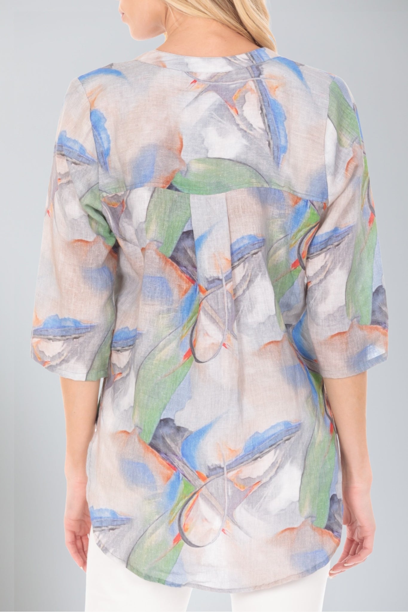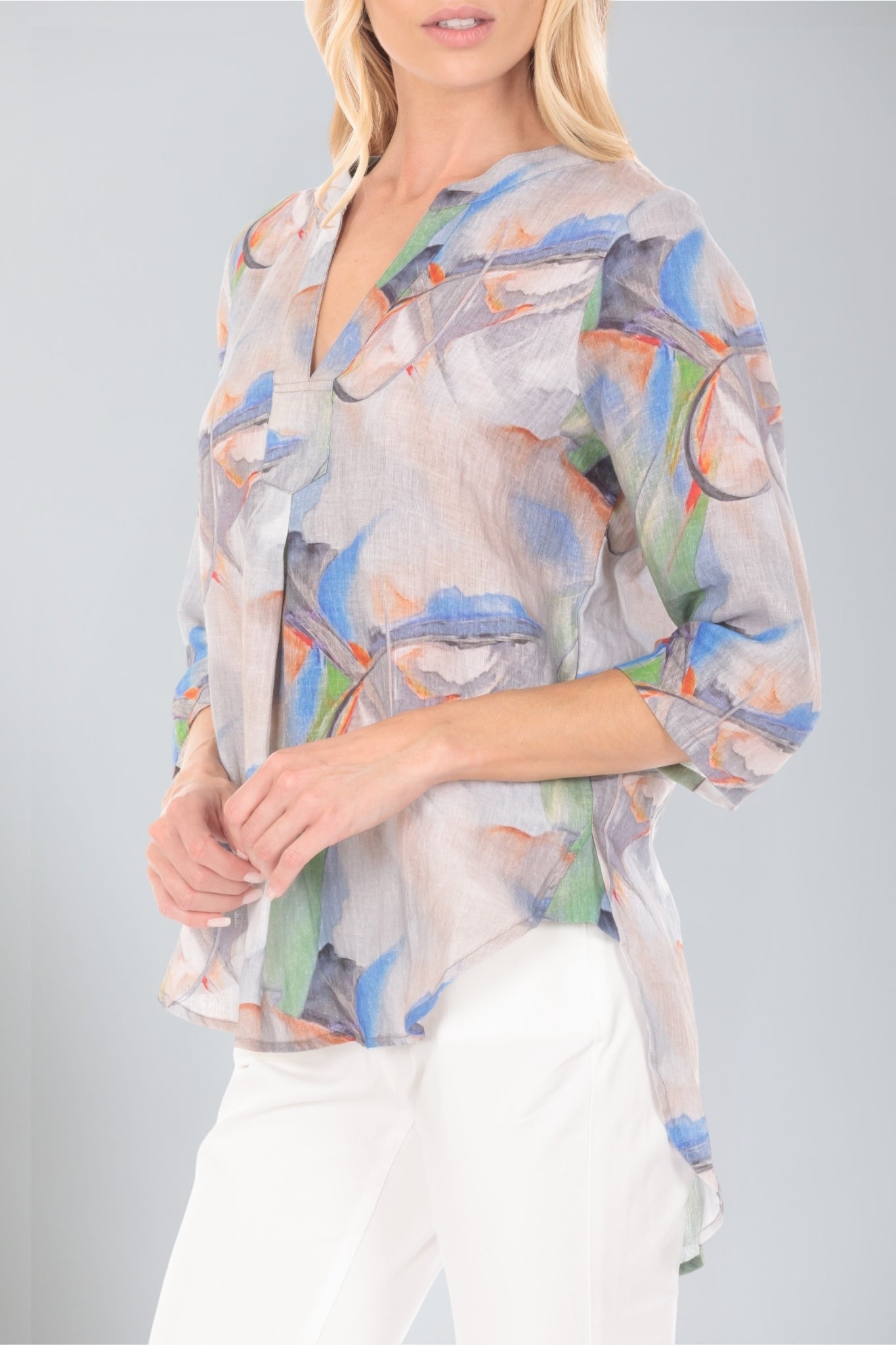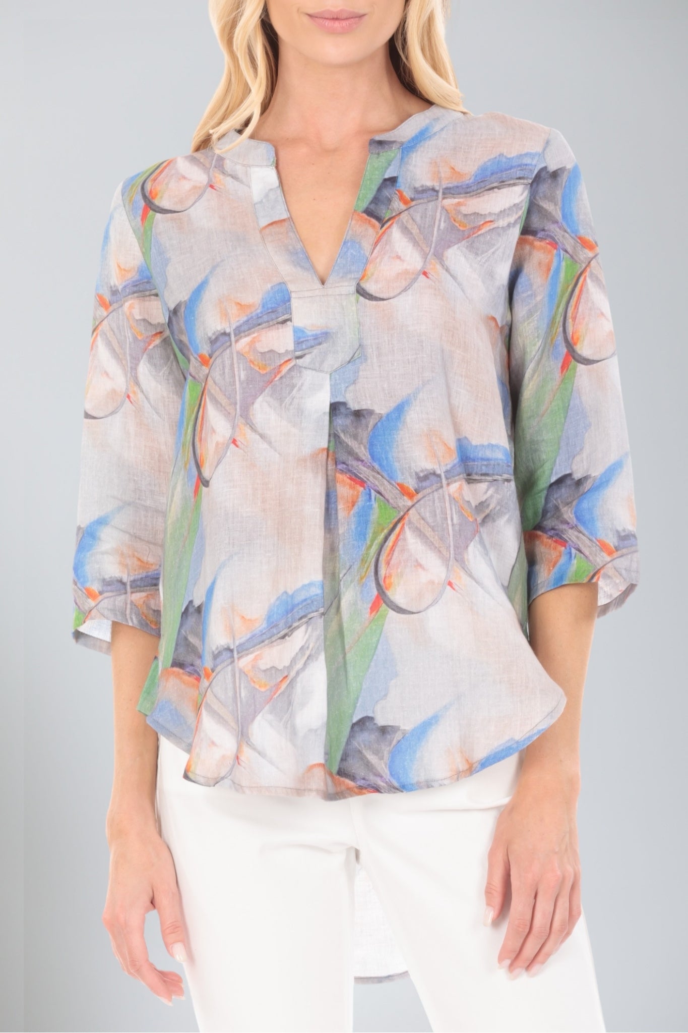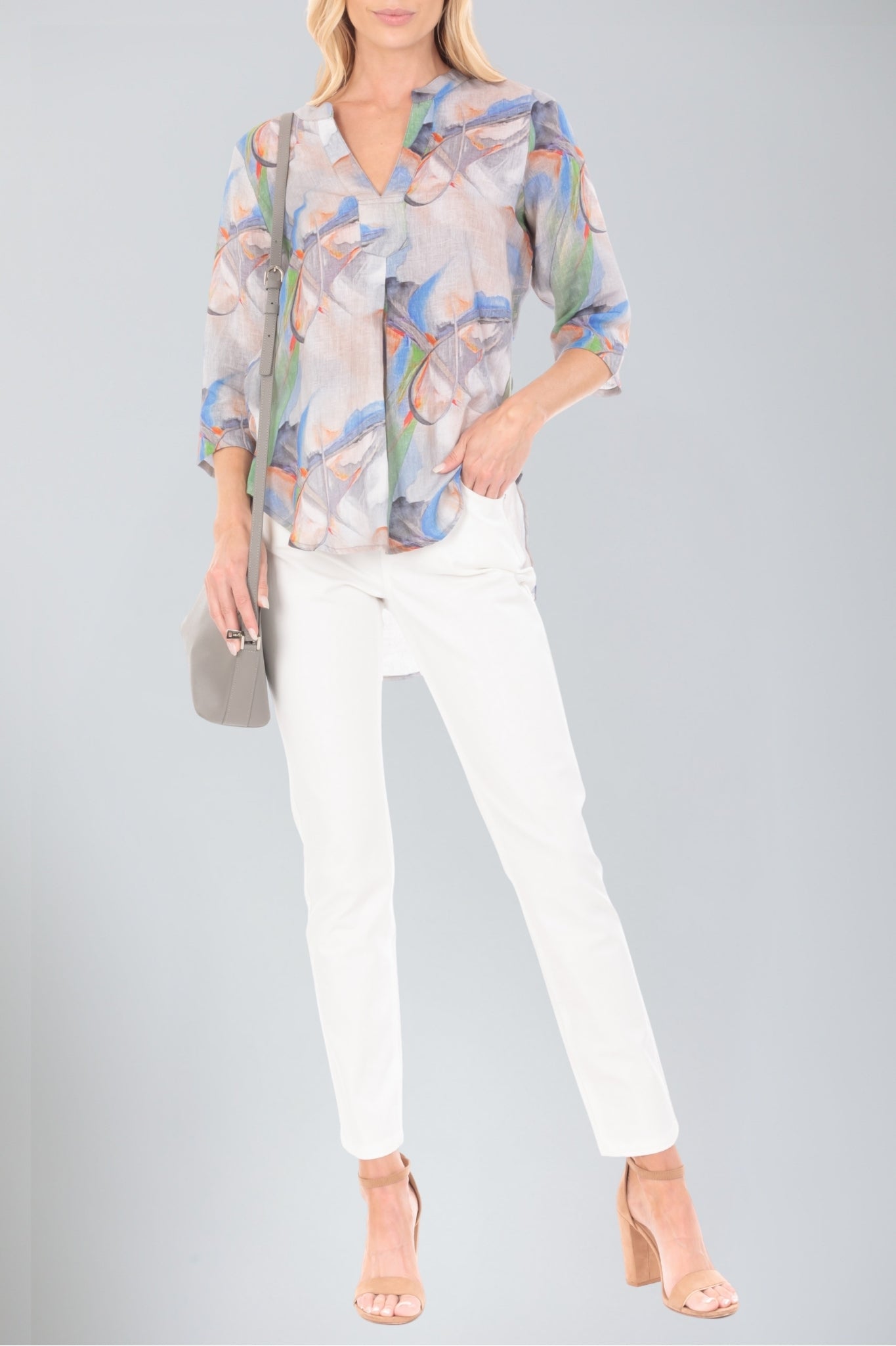 This flattering top will soon become a staple of your wardrobe with its modern high-low hem and flowy fit. The print pattern mixes vibrant hues for a sophisticated result, and the split V-neck are perfect for showcasing colorful jewelry. Have fun creating interesting looks by pairing this stunning piece with a dark denim wash and wedges!