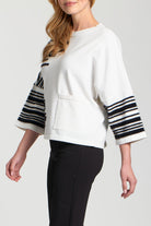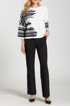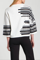 Elevate your casual style with this artistic Fuzzy Yarn Pullover Sweater, a cozy piece featuring a modern abstract stripe motif in a high-contrast black and white palette. Crafted from a soft, textured yarn, this sweater offers a comfortable, relaxed fit with a classic crew neckline. The three-quarter length sleeves and horizontal blocks of the pattern create a contemporary, oversized look, perfect for effortlessly chic layering over basic trousers or denim.