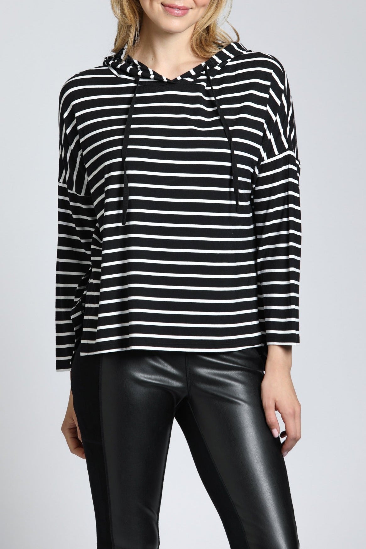 The Side Slit Hoodie will keep one warm in style. Made from viscose & spandex, this sweatshirt allows for a relaxed cut with extra room for comfort due to side slits. The black and white striped design will help you pull off that chill weekend vibe or a weekday grocery run. Its soft fabric and minimalistic approach make this an excellent option for layering. A must-have casual hoodie for your joggers or jeans.