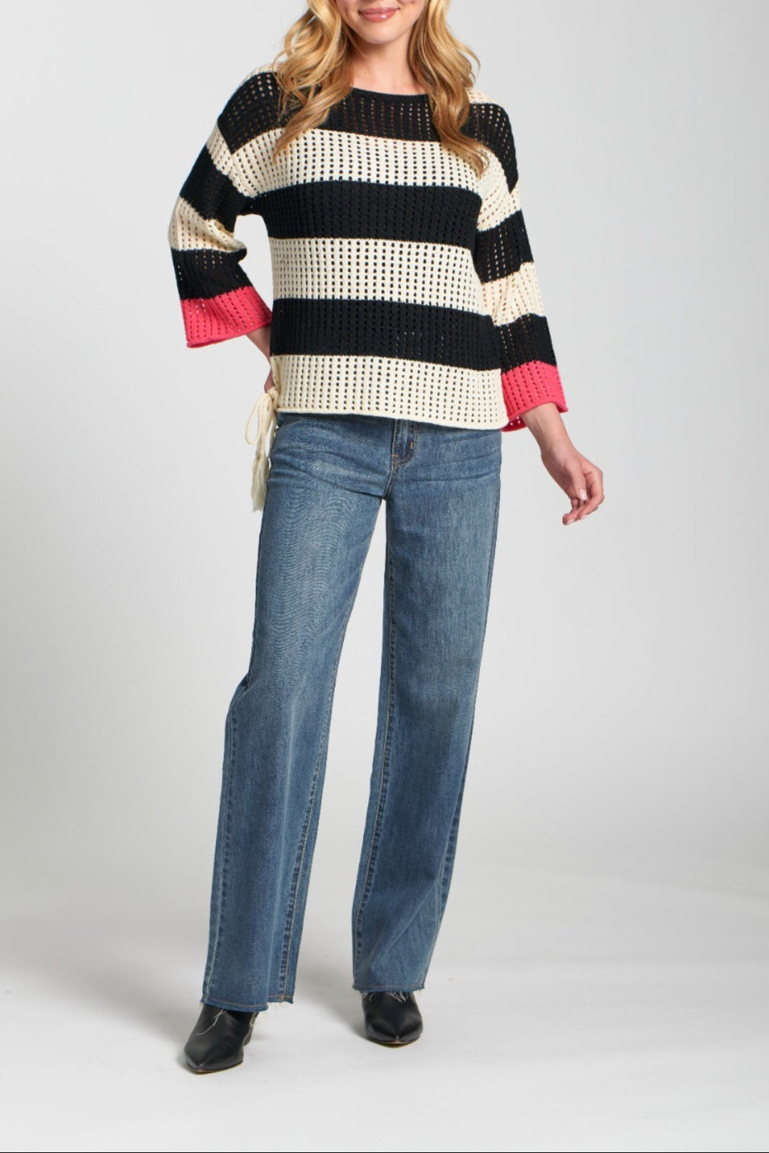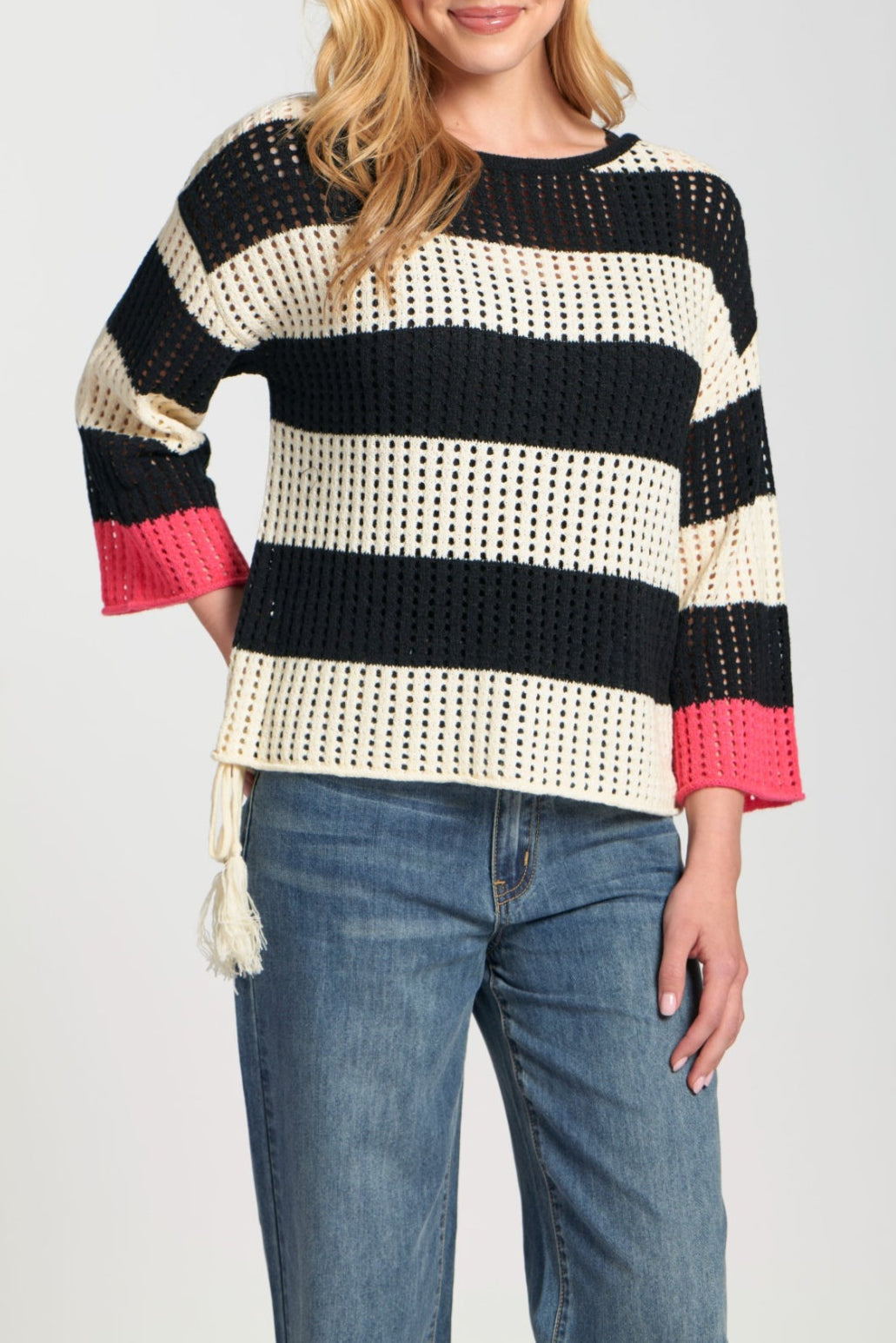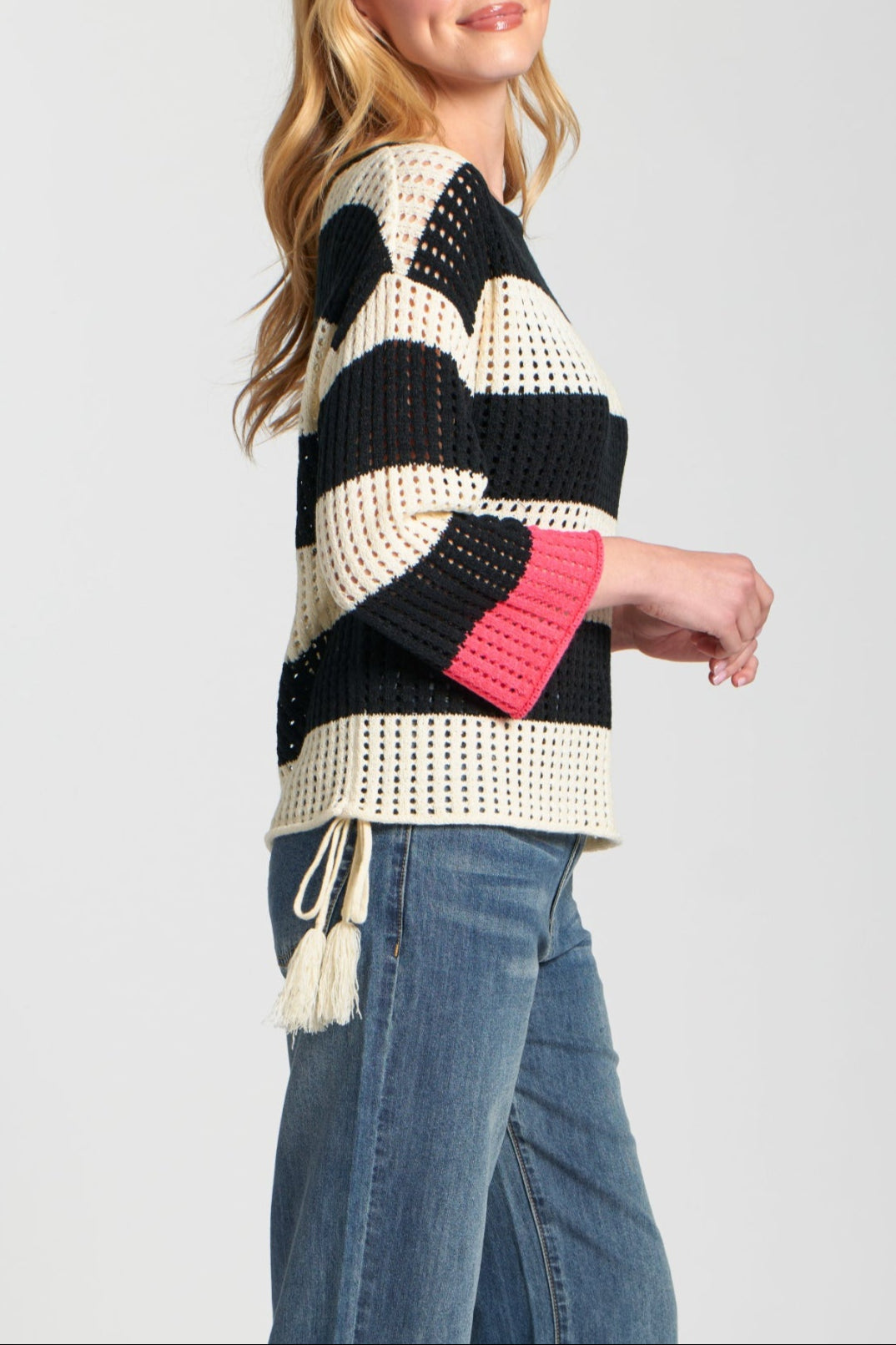 Stay stylish and comfortable in this eye-catching striped crochet sweater. Designed with bold black, ivory, and coral color-blocked stripes, it features a breathable open-knit pattern perfect for layering. The sweater has a pull-on closure for easy wear and a relaxed silhouette for everyday comfort. The three-quarter length sleeves add a touch of effortless charm, while side tassel ties enhance the casual vibe.