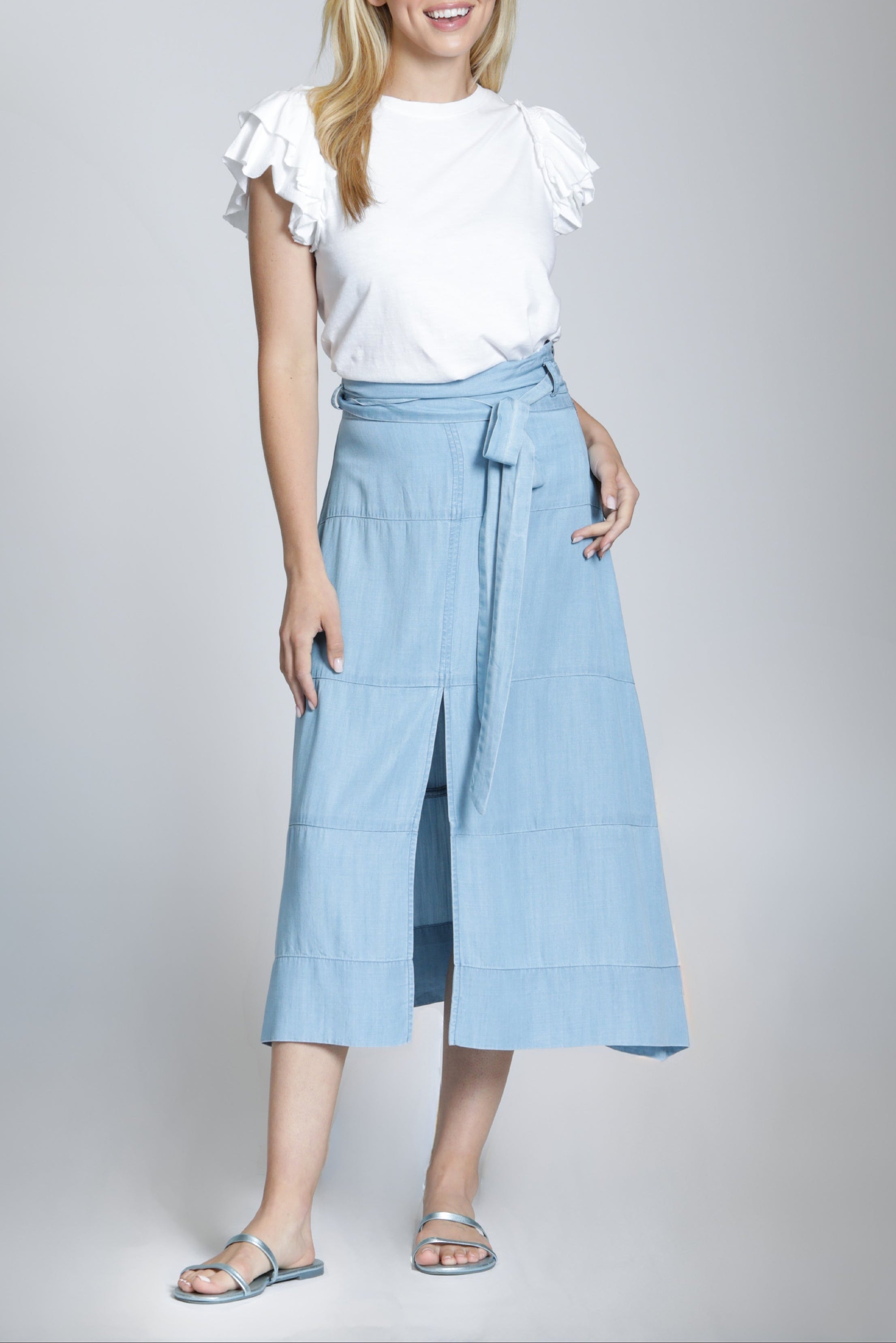 Casual, carefree charm defines this airy A-line skirt complete with a matching tie belt.