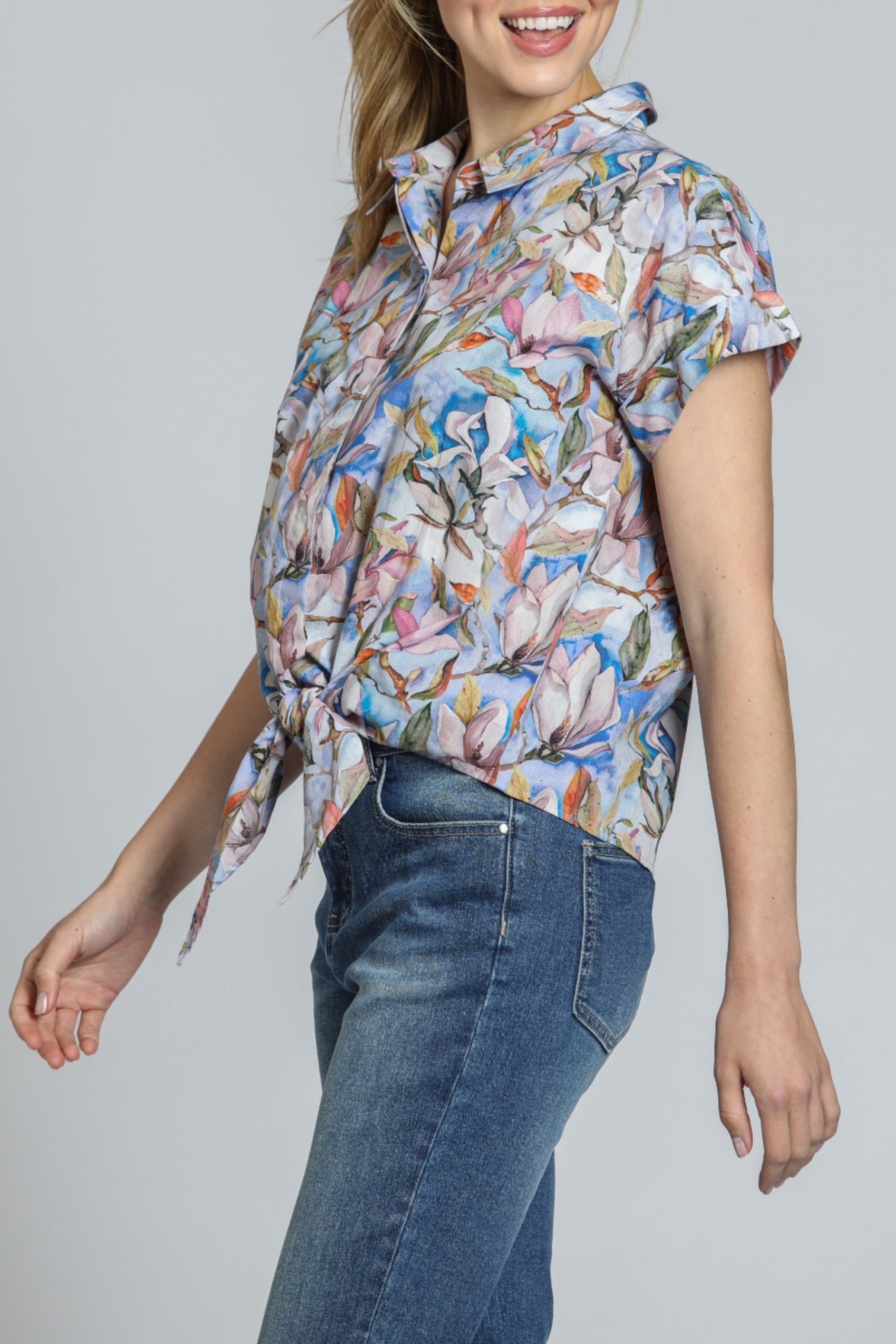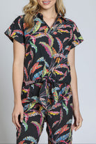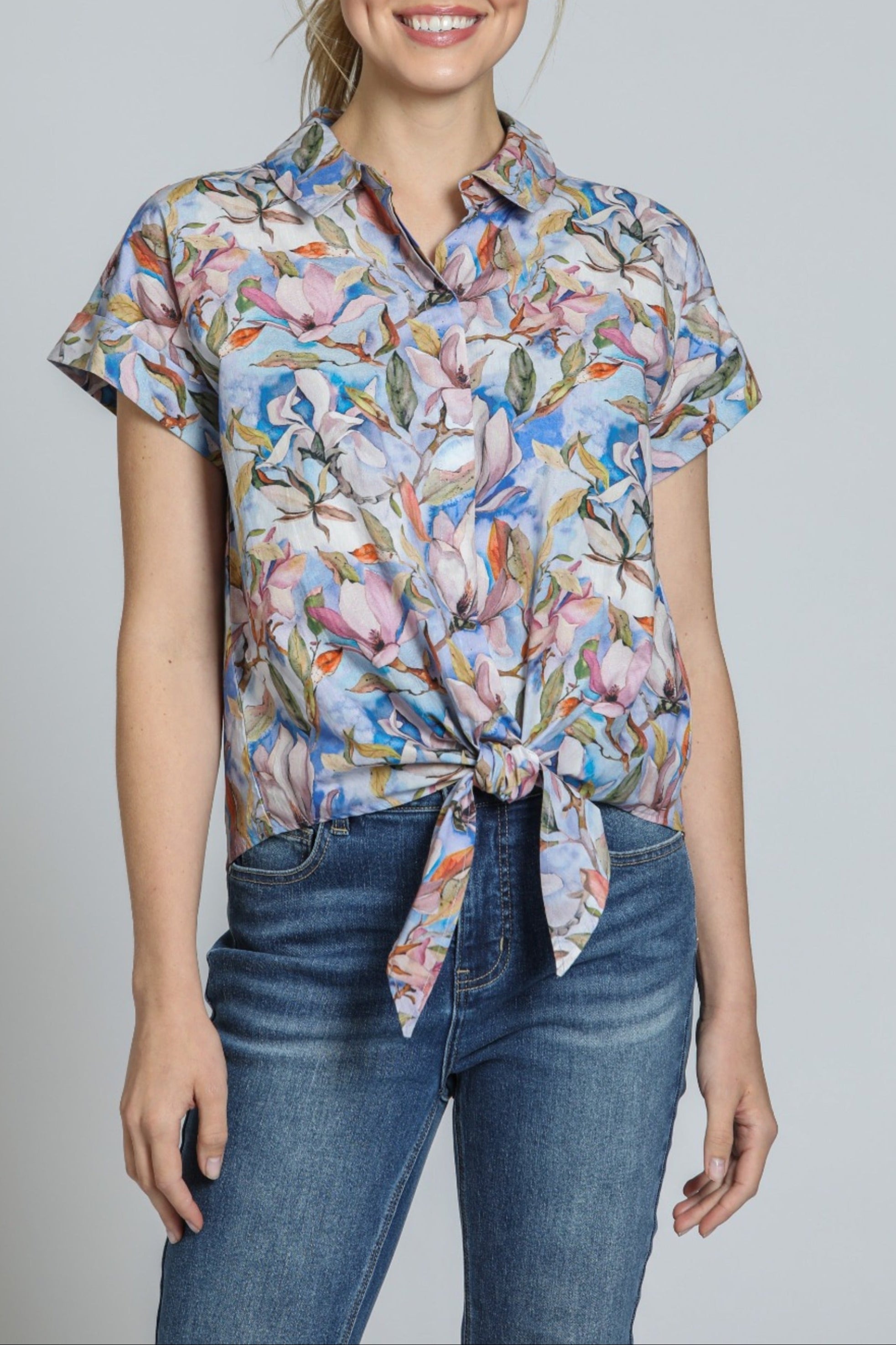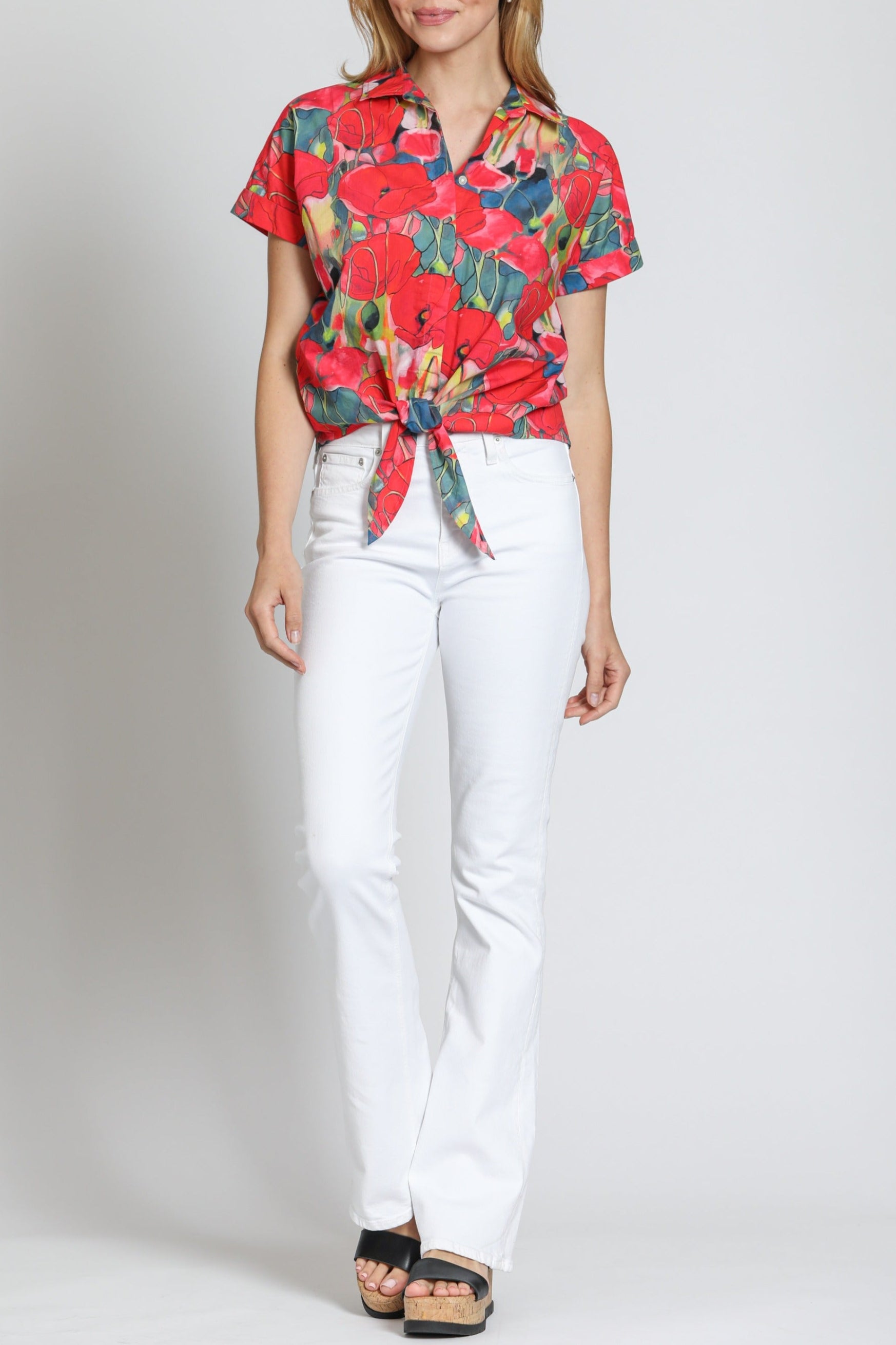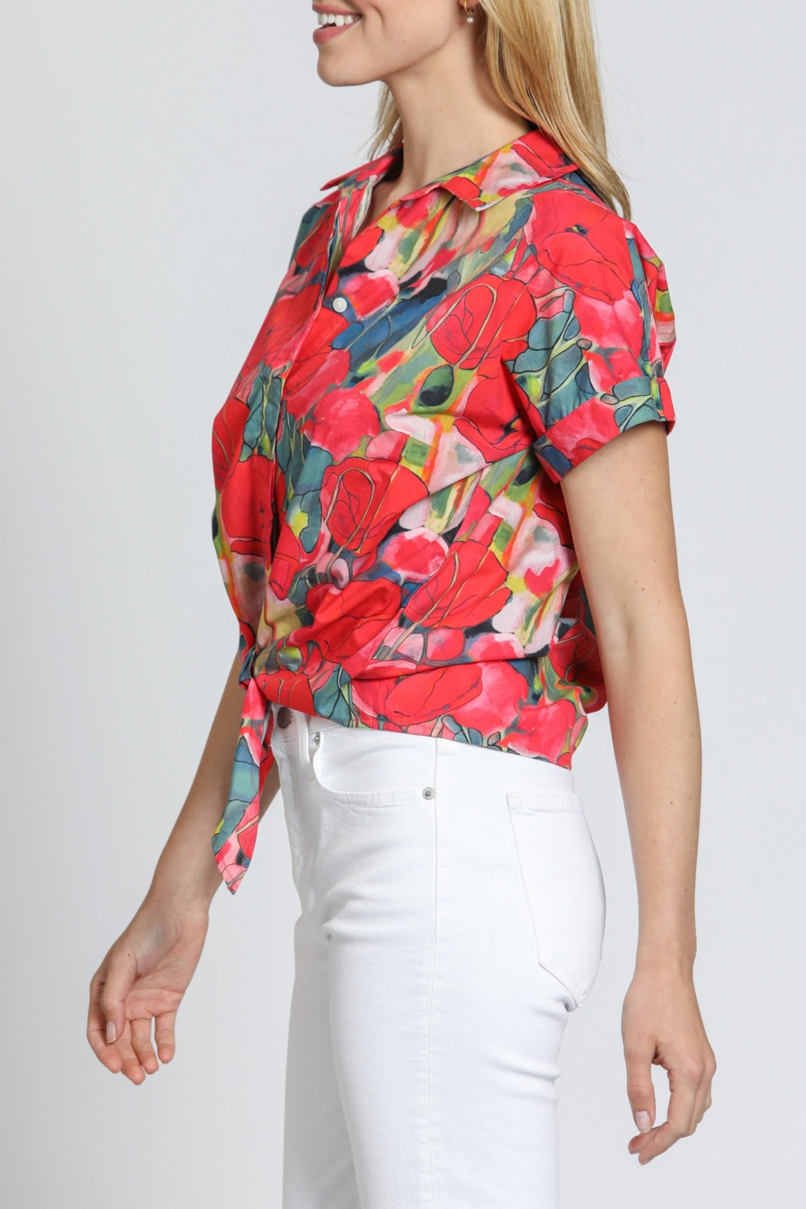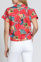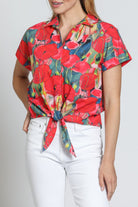 Mesmerizingly blossom printed Poppy Print - Tie Front Camp Shirt! This shirt is a delightful burst of style and color with a stunning poppy print that exudes charm and elegance. The tie front adds a touch and allows for customization of your fit to provide soothing comfort and relaxation. This flowy shirt is made from lightweight and breathable fabric to make it perfect for sunny days. Whether you plan to pair it with jeans for a casual AM to PM look or dress it up with a skirt for a night out, our Poppy Print Tie Front Camp Shirt will effortlessly level up your style game.