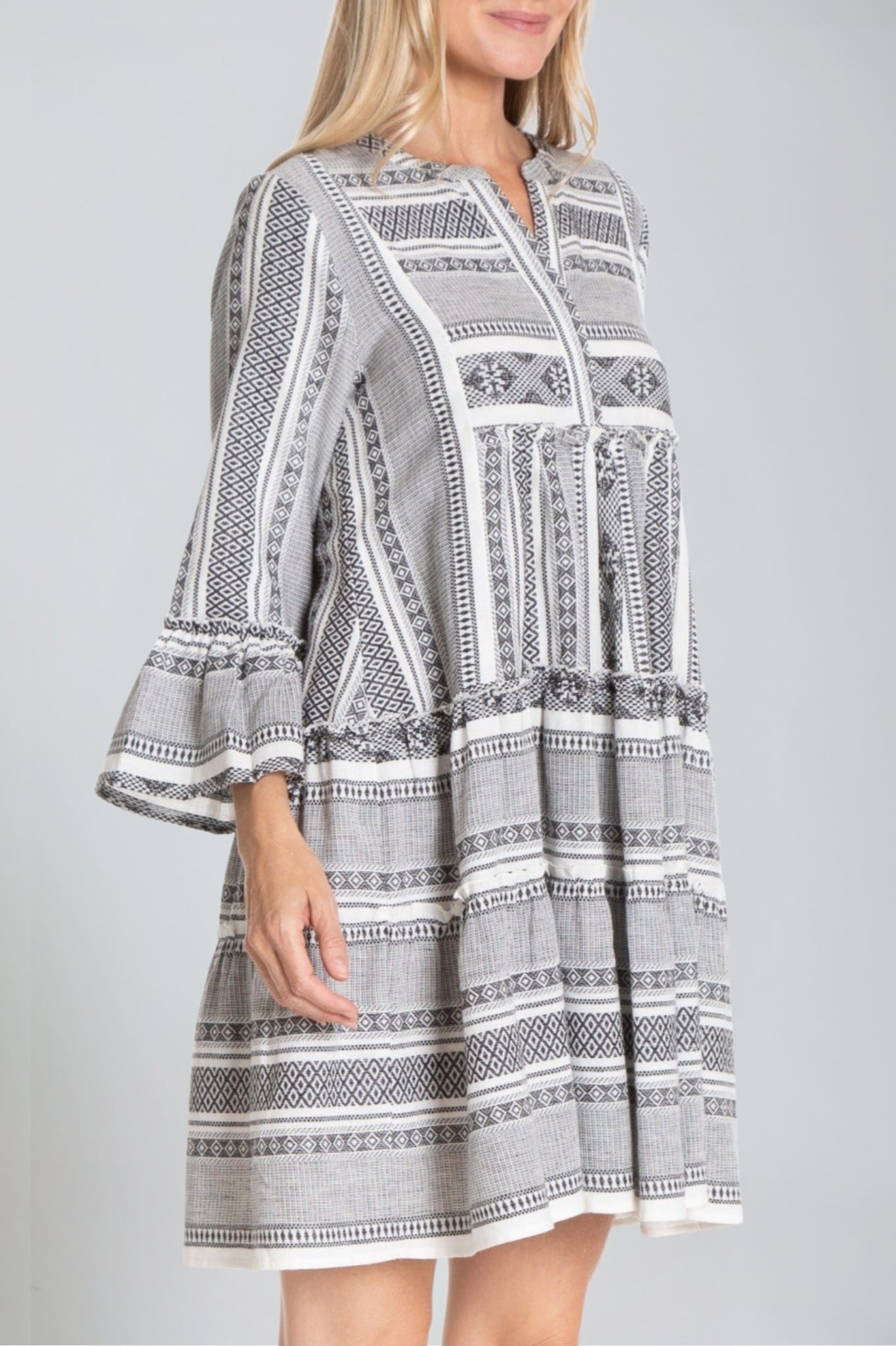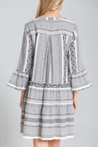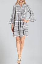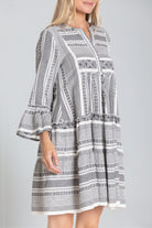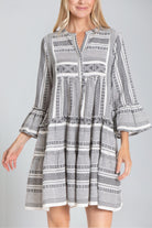 Embrace effortless elegance with the "Tiered Tunic Dress With Flounce Sleeve." This charming dress features a flowing tiered design that flatters every silhouette while offering breezy comfort. The flounce sleeves add a playful and feminine touch, making it perfect for casual outings, brunches, or special occasions. Crafted from lightweight, breathable fabric, this tunic dress is as comfortable as it is stylish. Pair it with sandals for a relaxed vibe or dress it up with heels and accessories for a polished look.