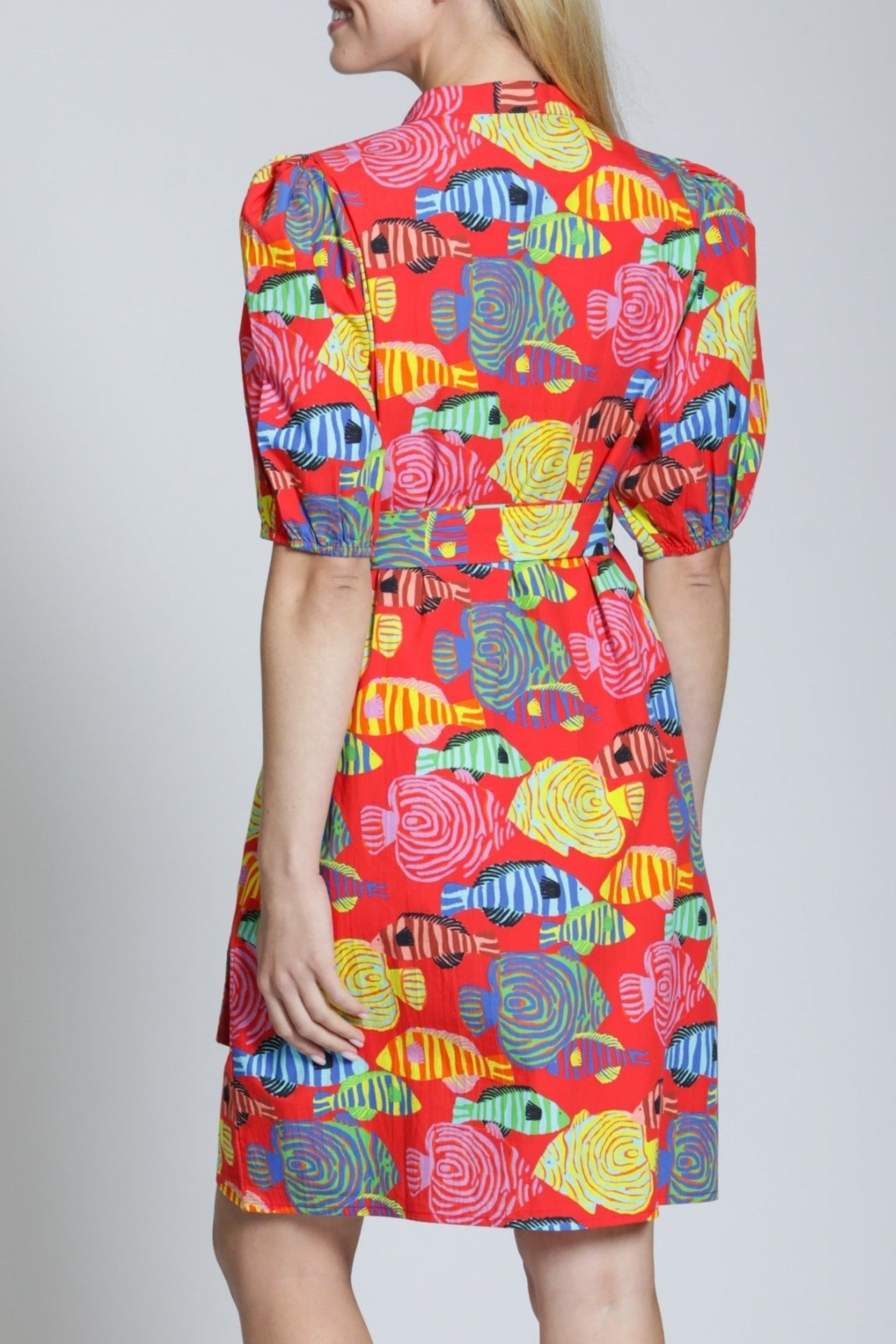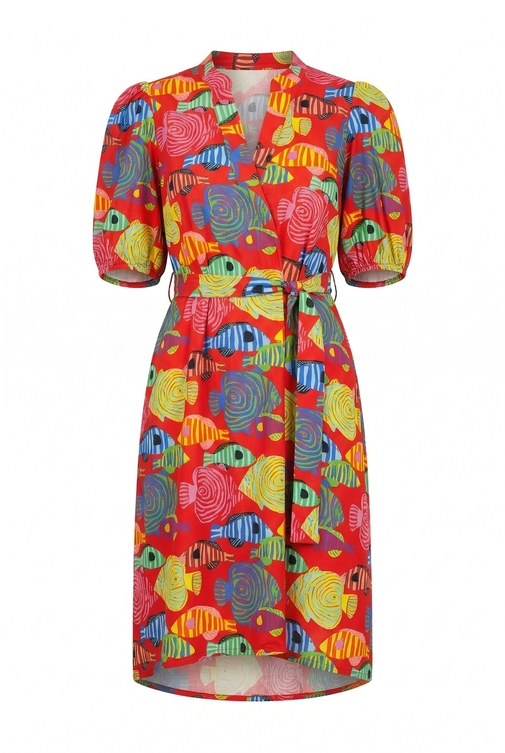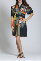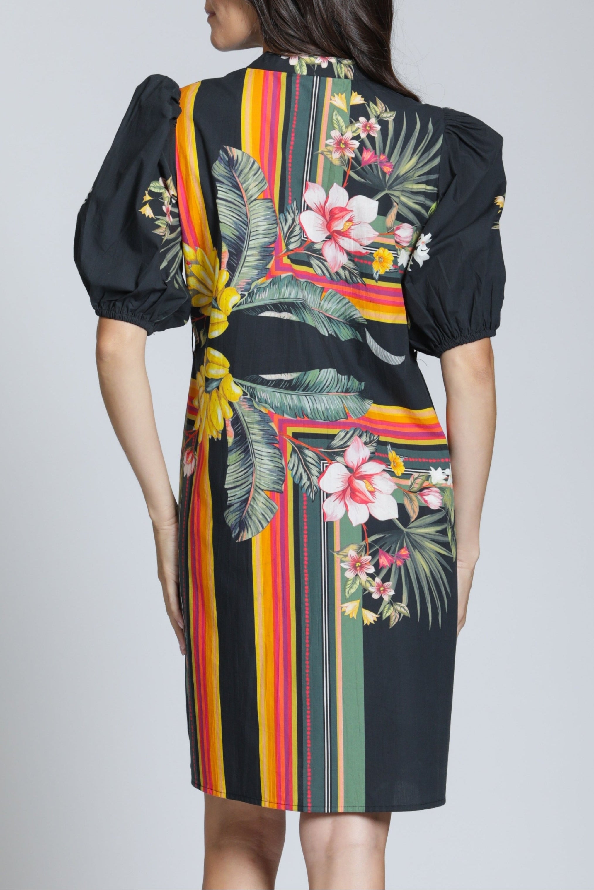 This stylish tunic dress is crafted from a comfortable woven fabric and features a flattering mini-length silhouette; the design includes a neat band collar that transitions into a partial button placket, and is detailed with feminine short puff sleeves that gently gather at the shoulder and cuff, creating a comfortable yet structured piece that serves as an excellent versatile option for both casual and semi-dressed-up occasions.