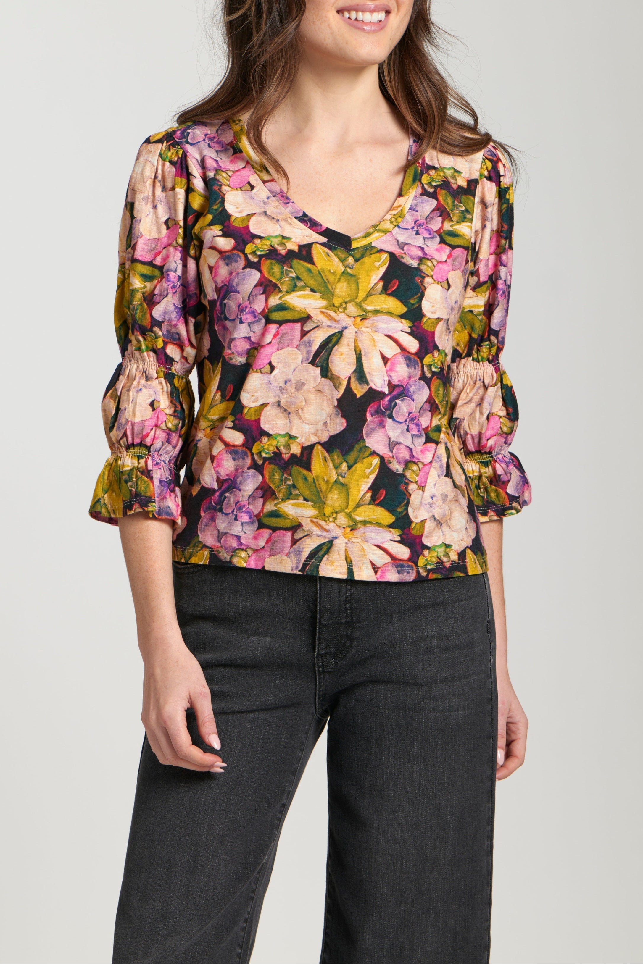 This stylish top features a V-neckline that flatters the neckline and adds a touch of elegance, paired with 3/4-length rushed puff sleeves that offer a soft, feminine silhouette. The rushed detailing along the sleeves adds texture and volume, creating a romantic yet modern look. Perfect for both casual days and dressier occasions, this top brings comfort and charm together effortlessly.