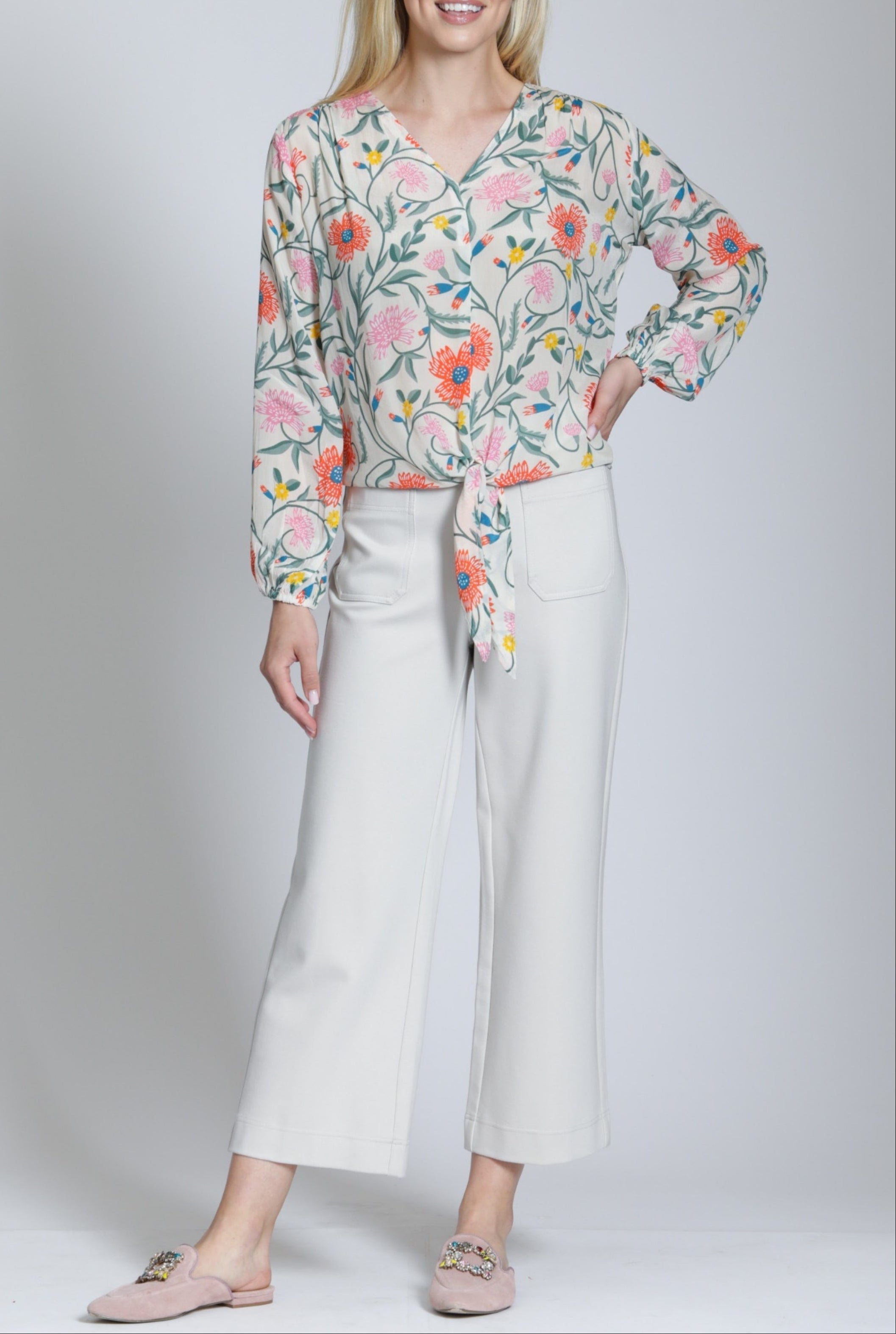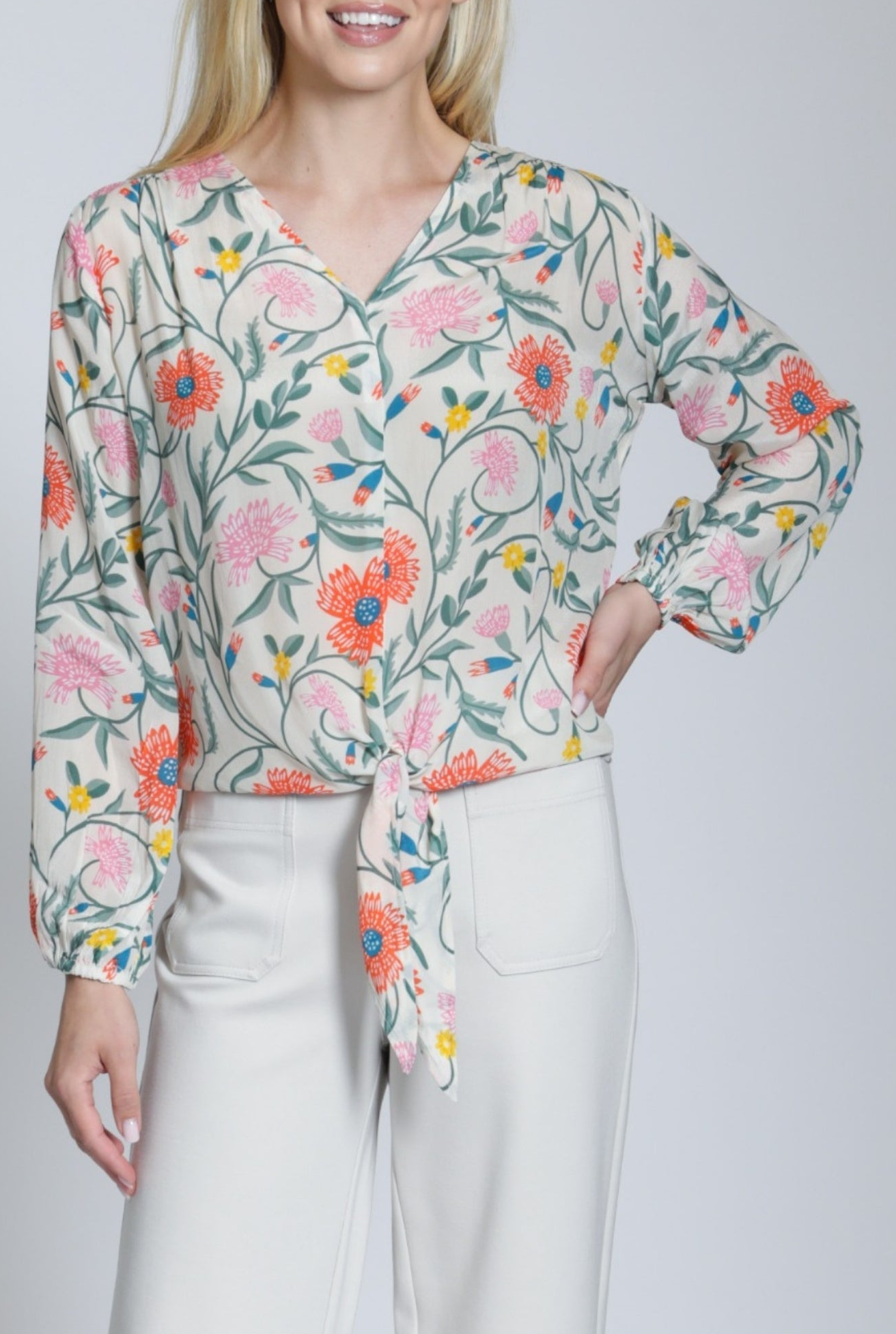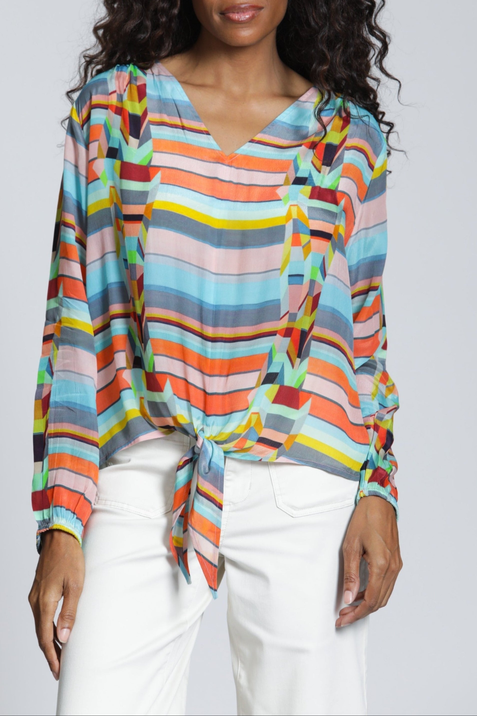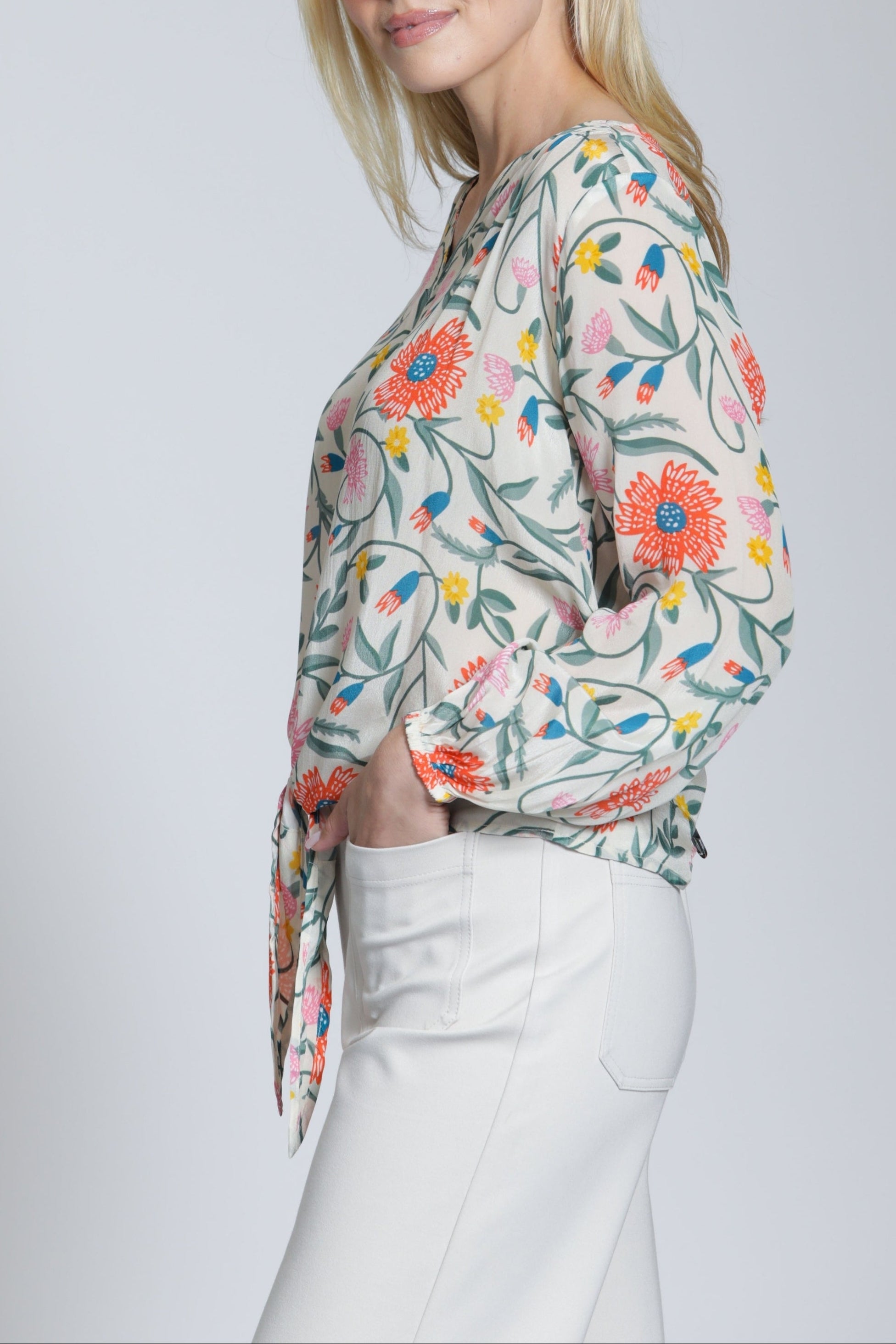 Gathered shoulders enhance the roomy fit of this lively printed top punctuated with a shaping tie hem.