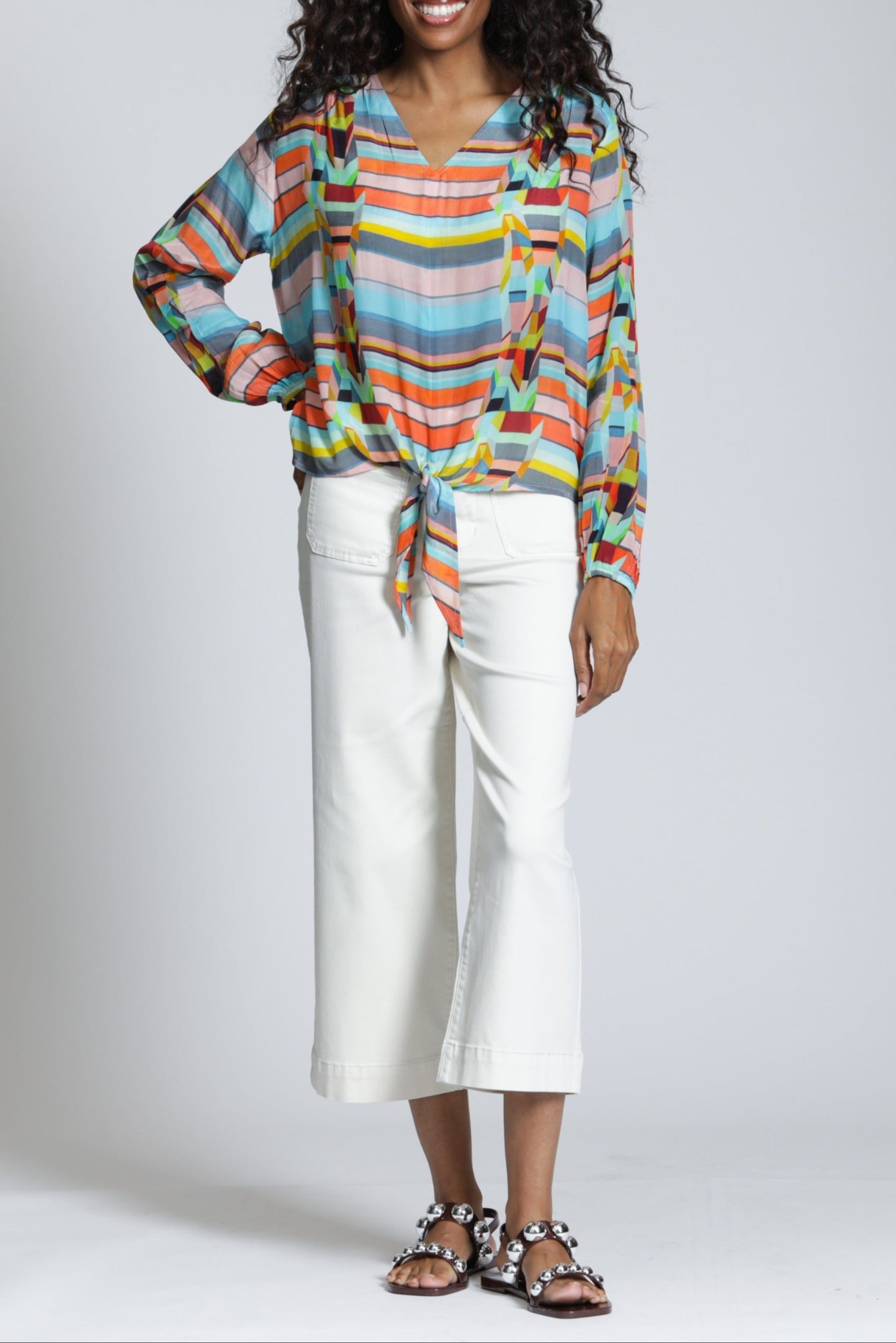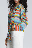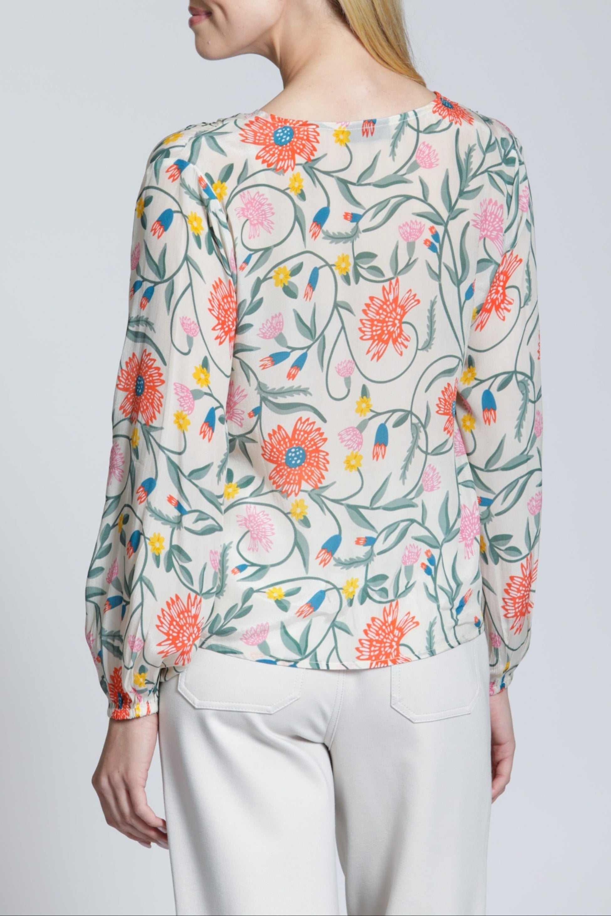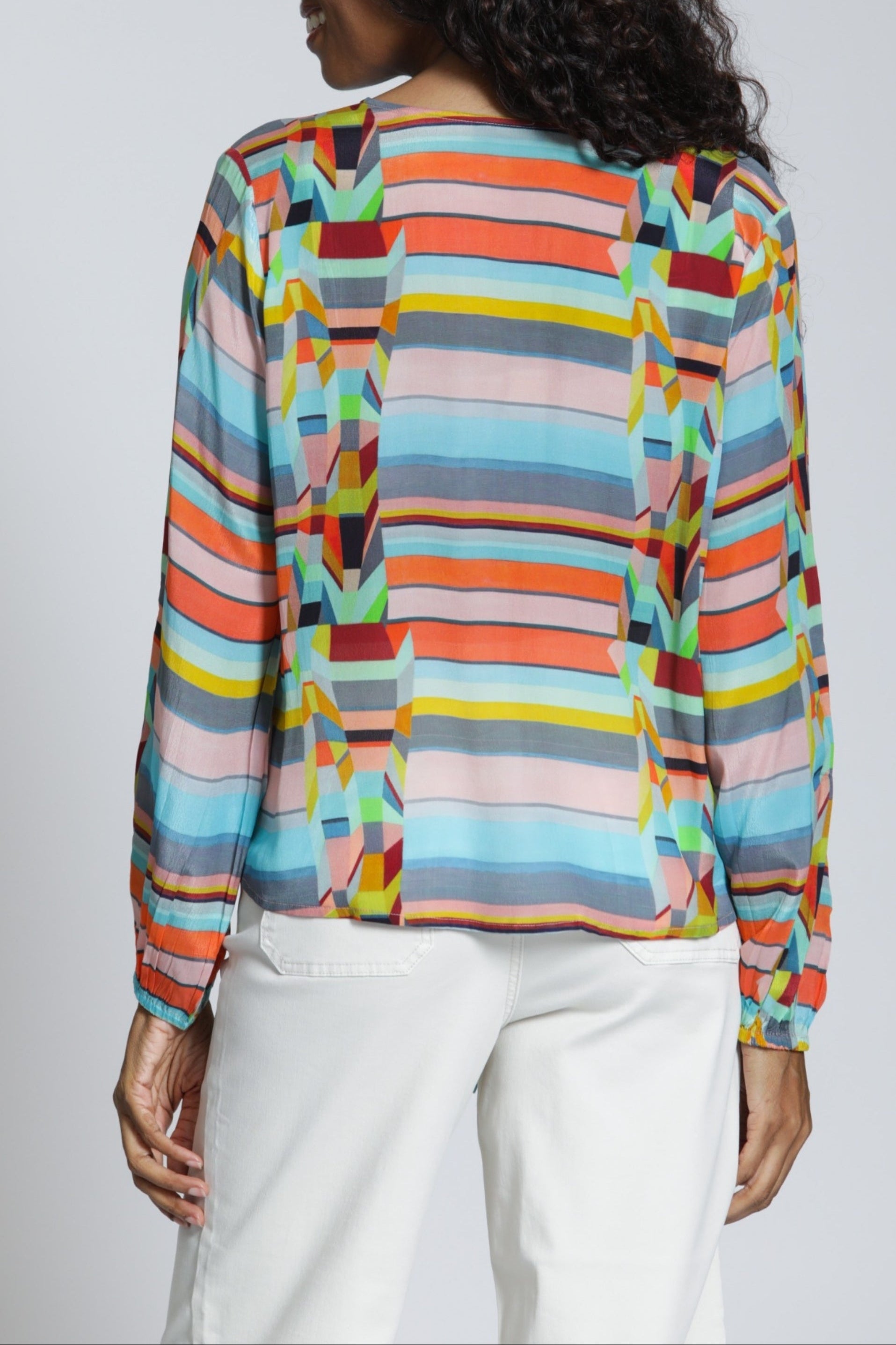Gathered shoulders enhance the roomy fit of this lively printed top punctuated with a shaping tie hem.