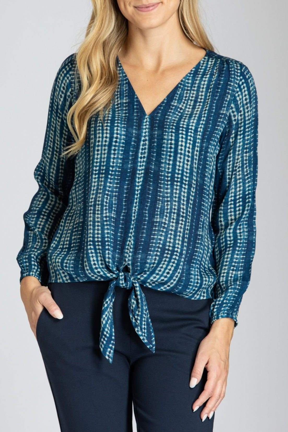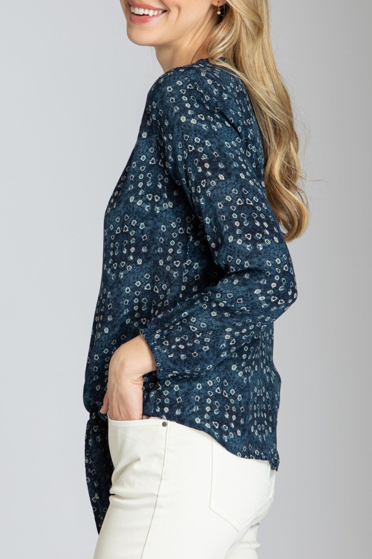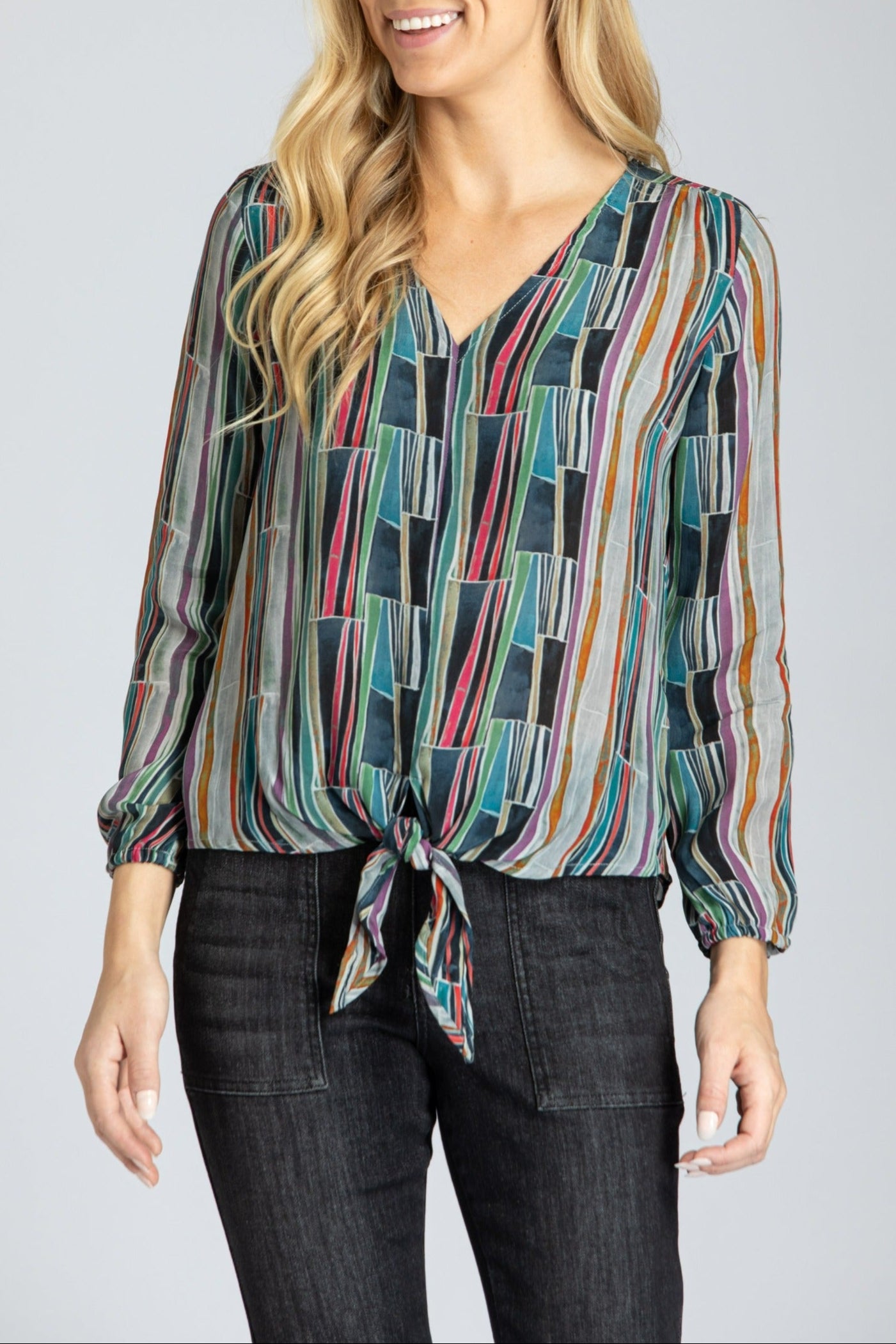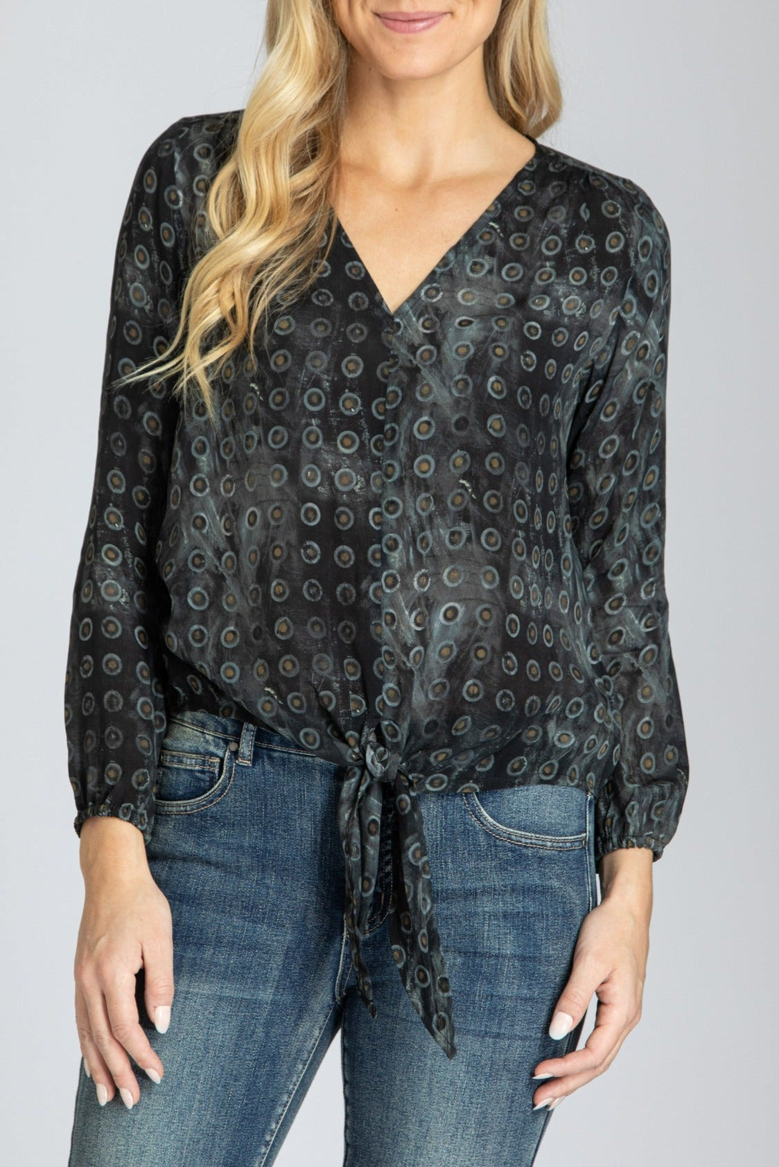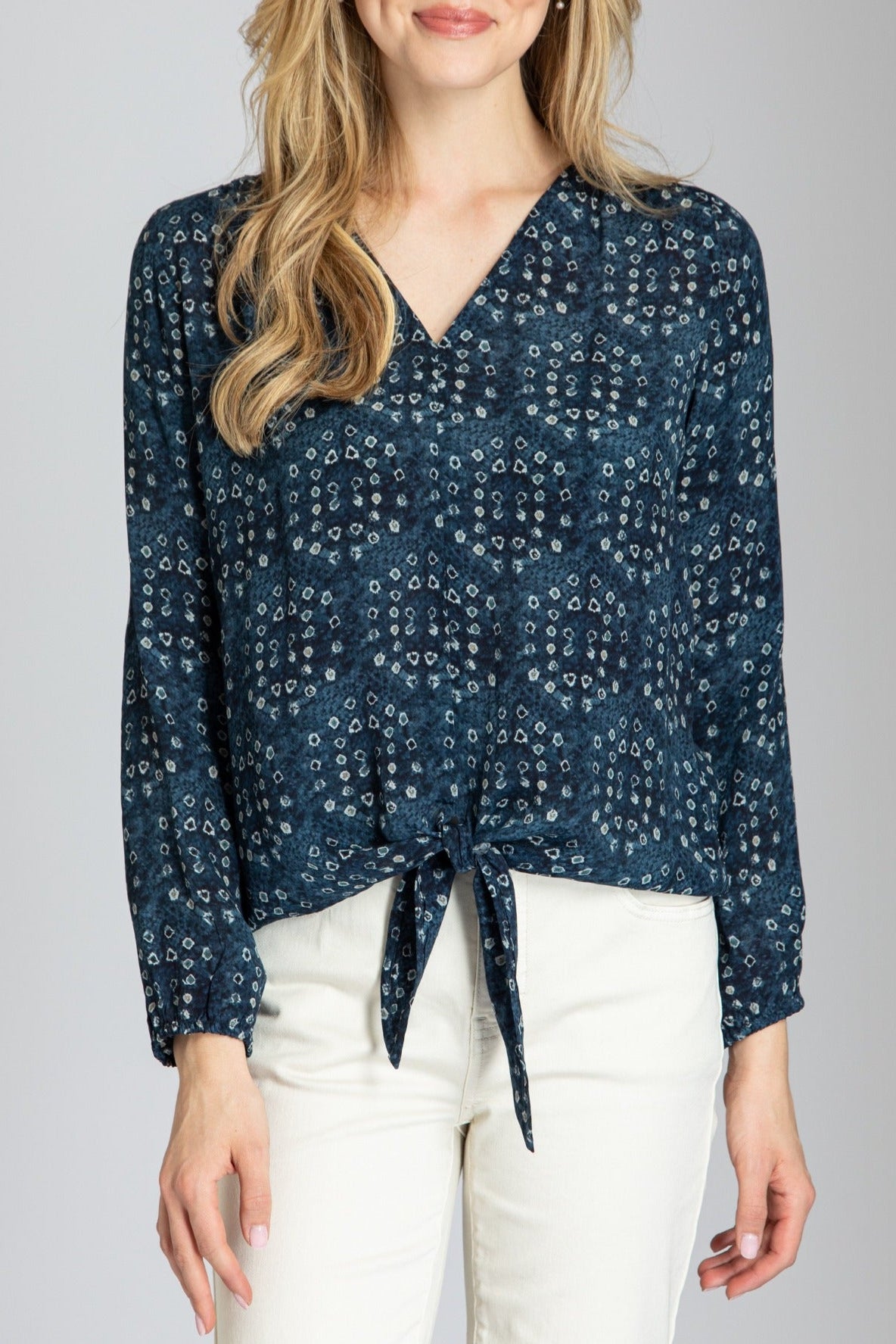 This versatile tie-front creates visual interest with our beautiful prints that draw interest to the front closure. The button down look and v-neck help create a flattering silhouette. This top is a timeless piece that will look chic with a pair of skinny jeans, but you can also dress it down with shorts.