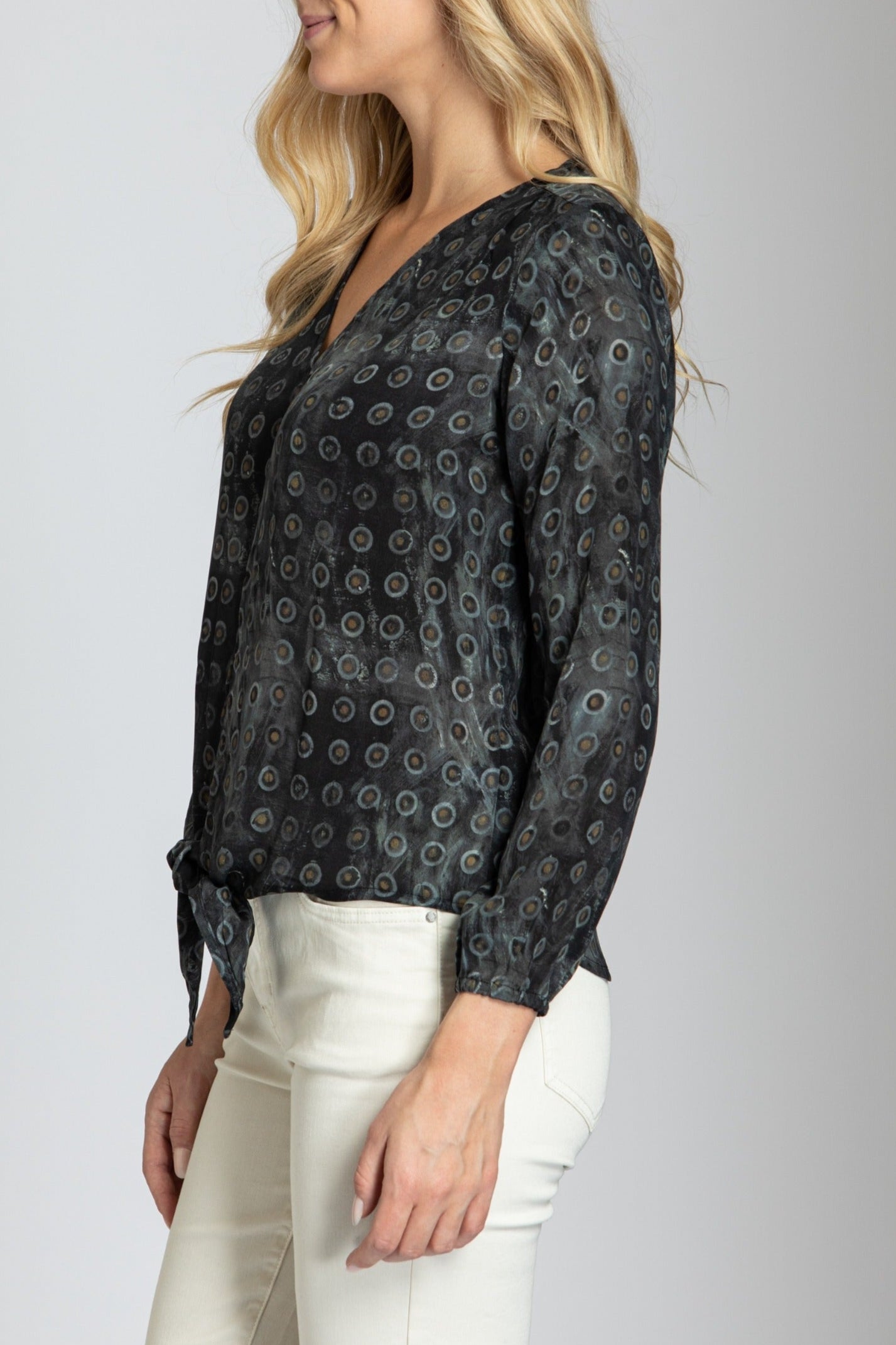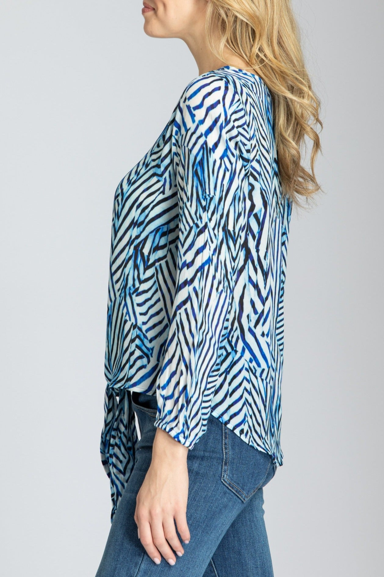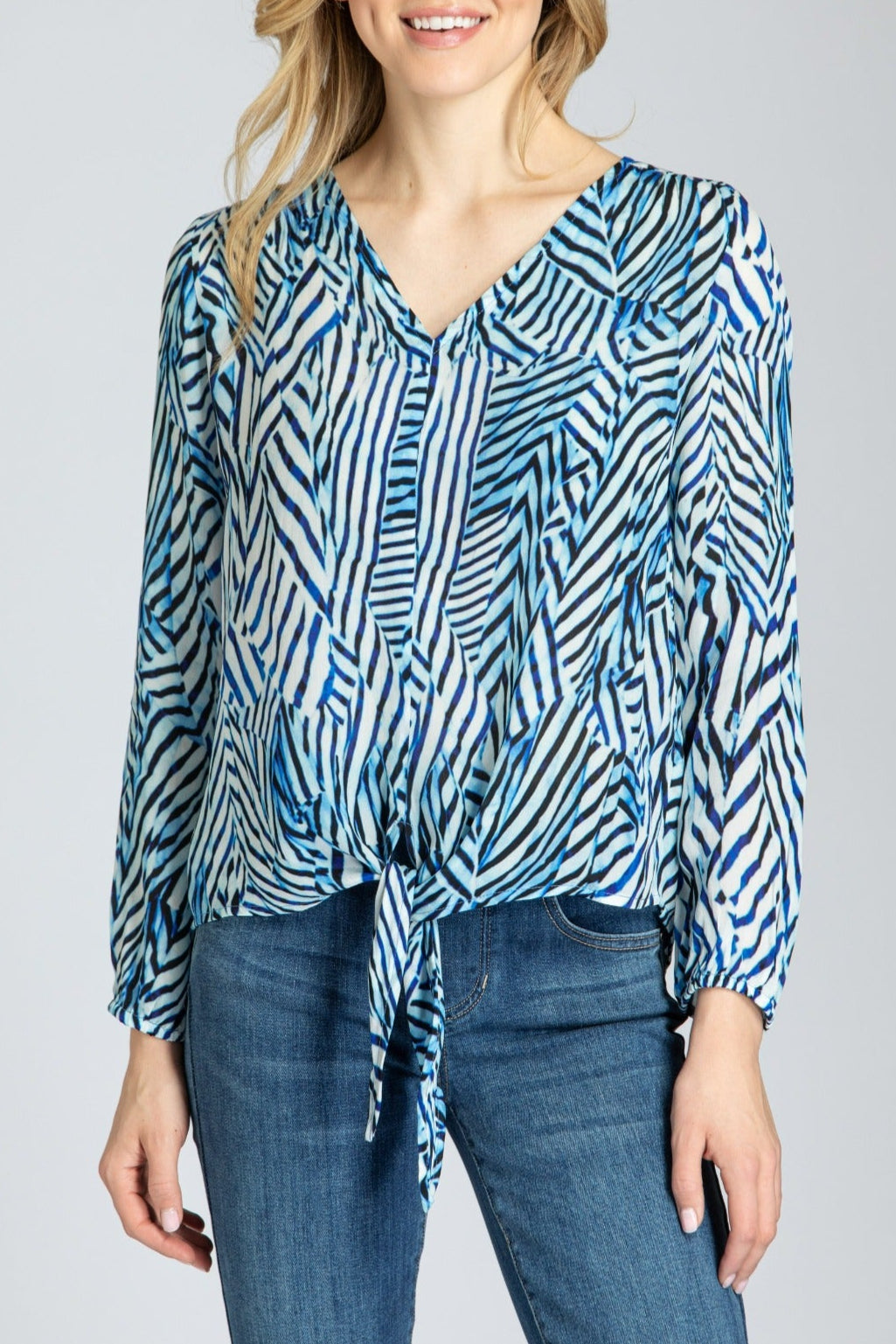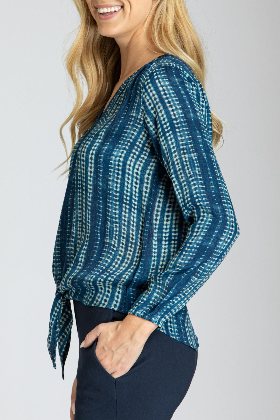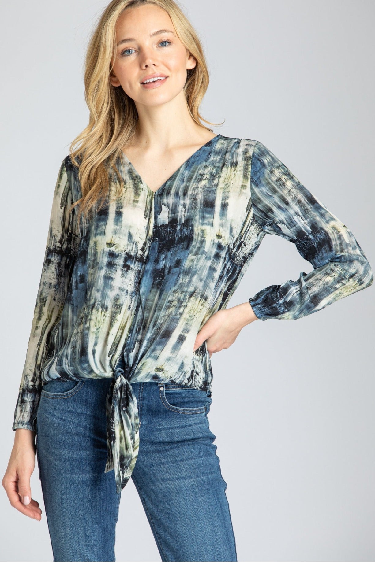 This versatile tie-front creates visual interest with our beautiful prints that draw interest to the front closure. The button down look and v-neck help create a flattering silhouette. This top is a timeless piece that will look chic with a pair of skinny jeans, but you can also dress it down with shorts.