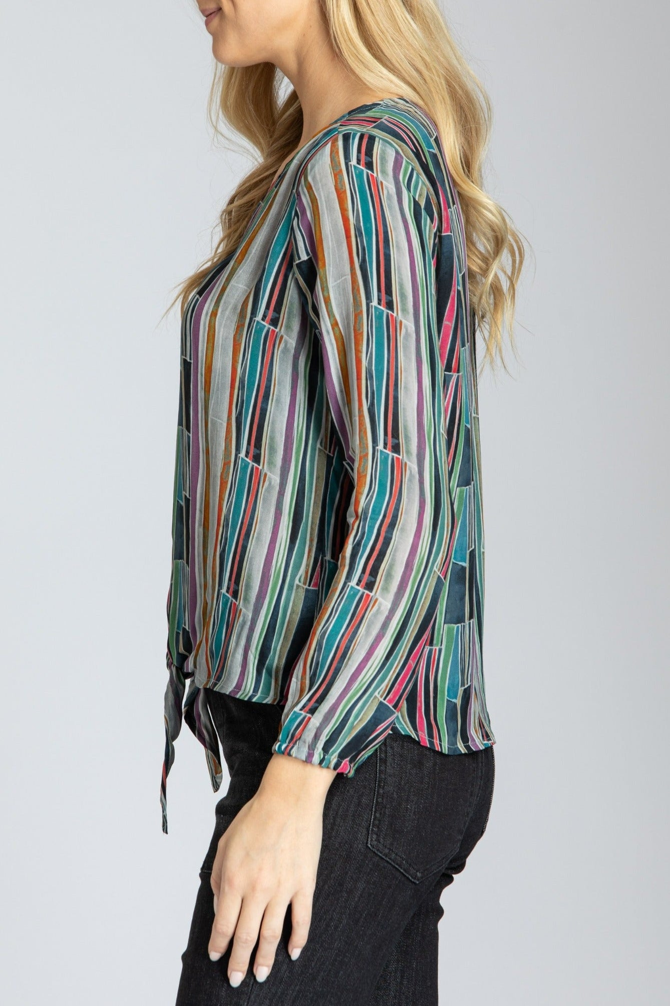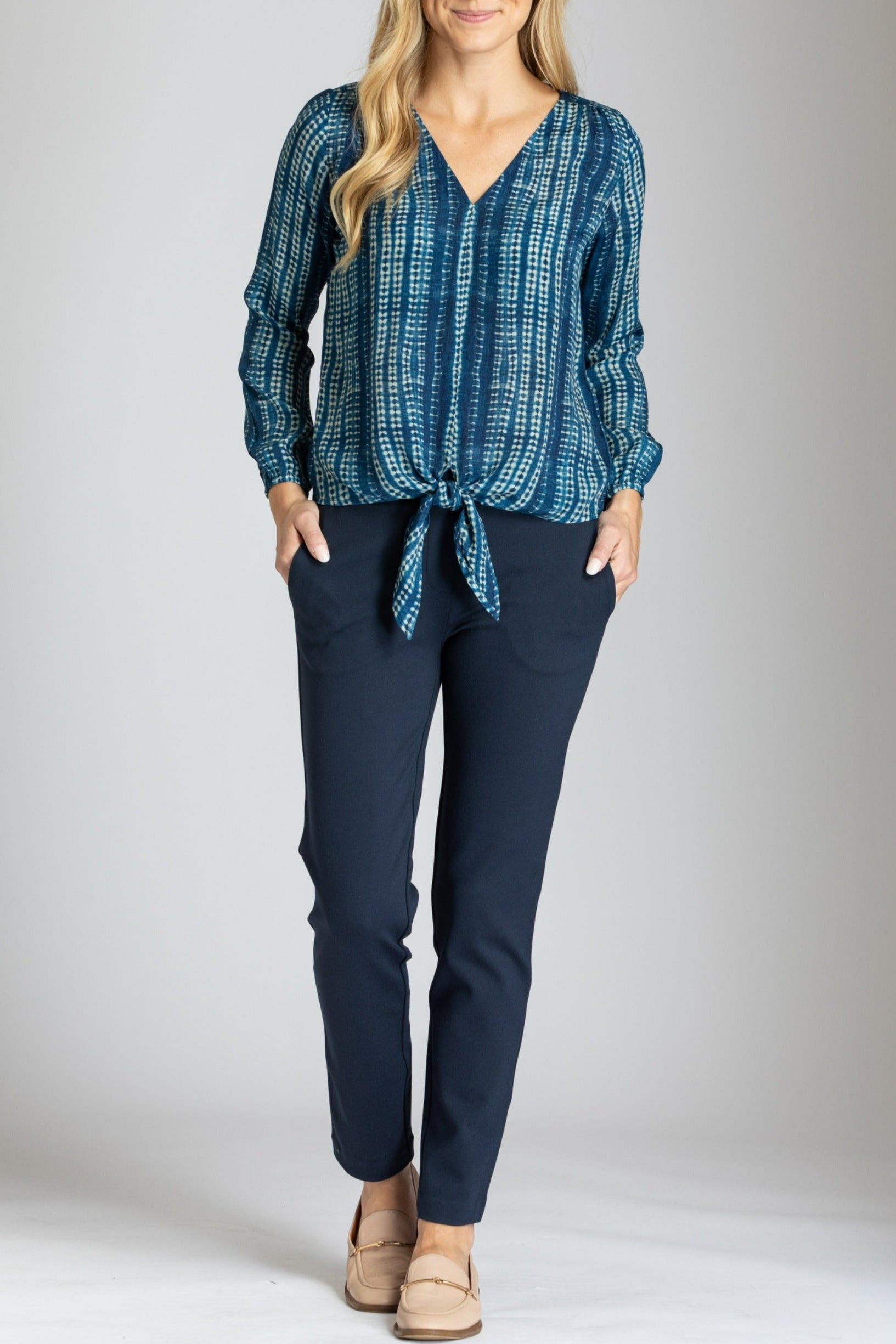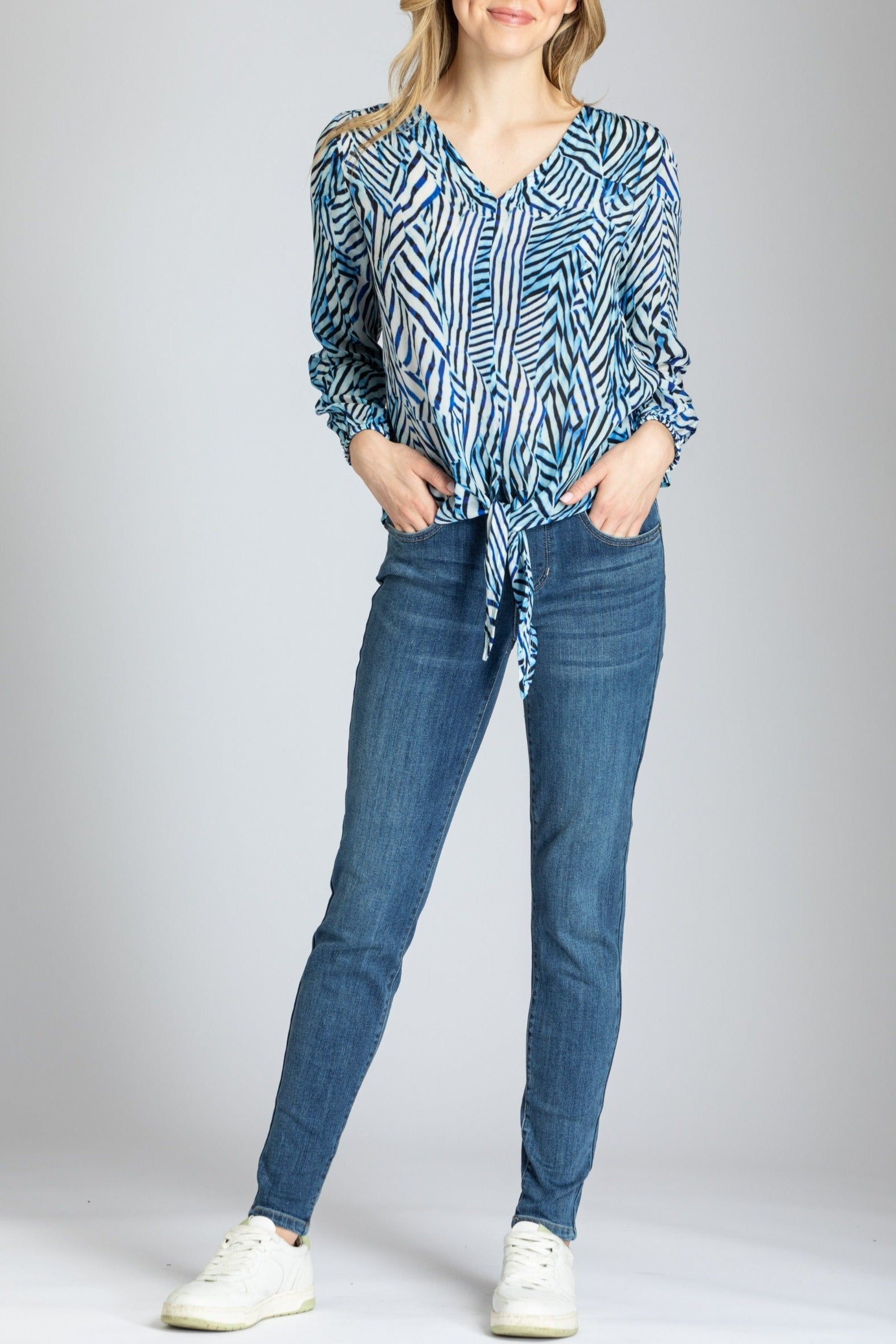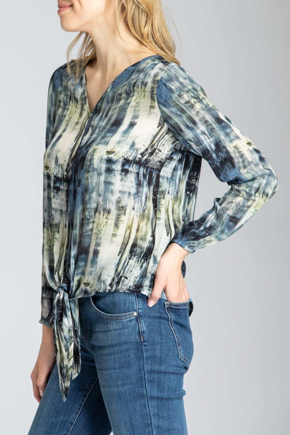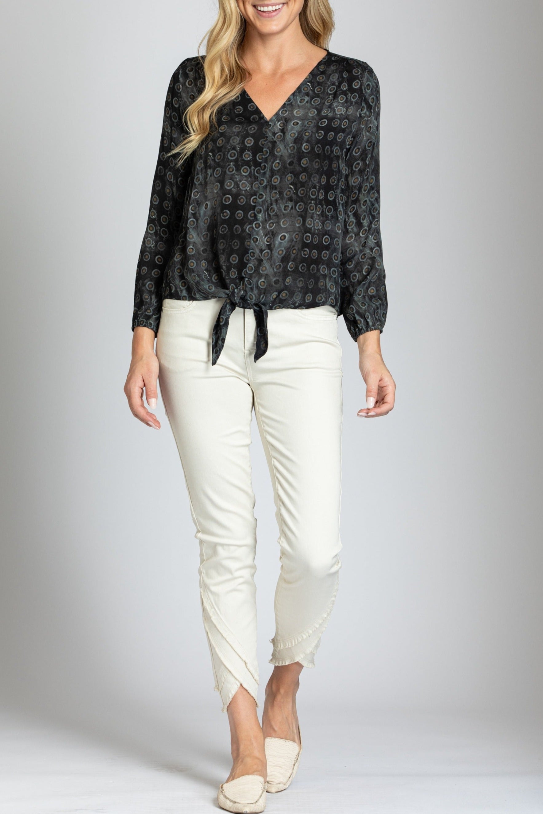 This versatile tie-front creates visual interest with our beautiful prints that draw interest to the front closure. The button down look and v-neck help create a flattering silhouette. This top is a timeless piece that will look chic with a pair of skinny jeans, but you can also dress it down with shorts.