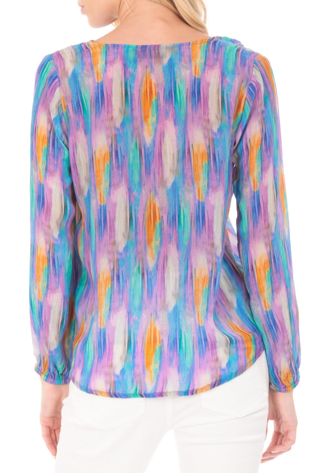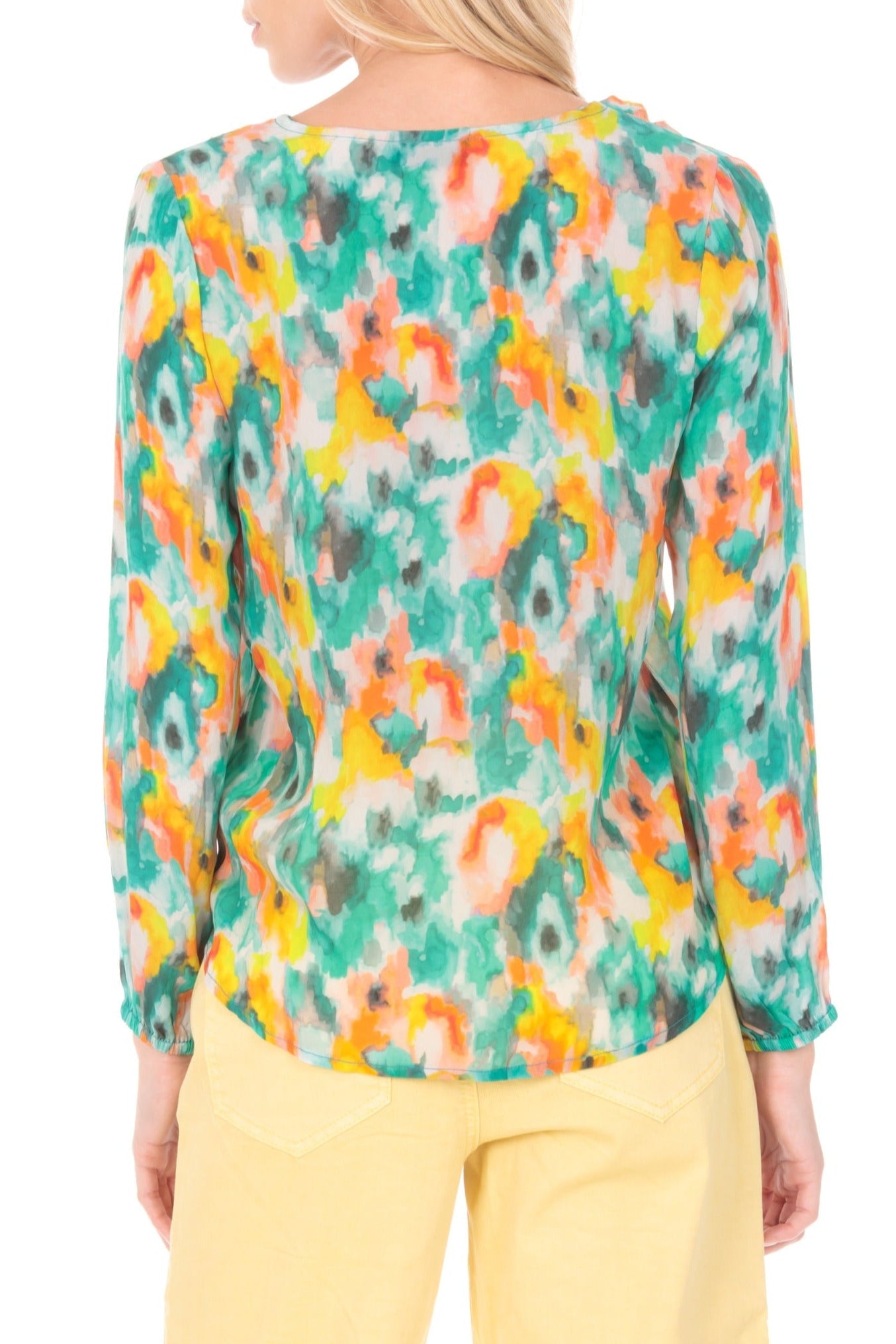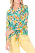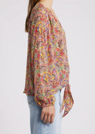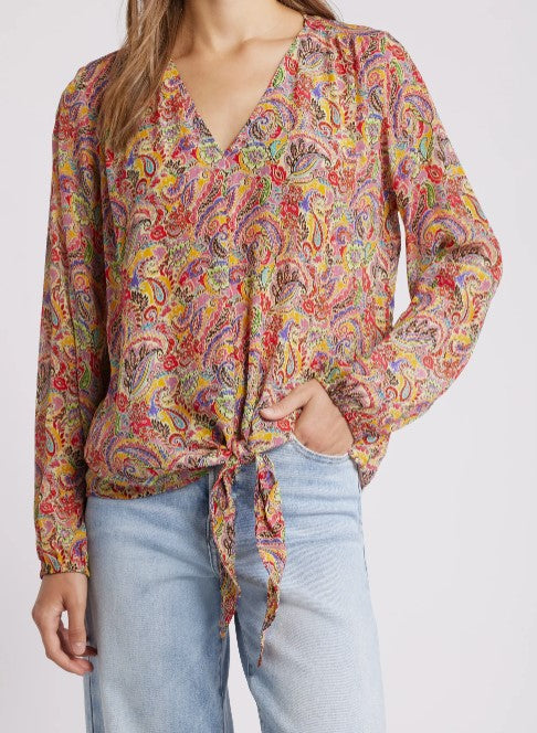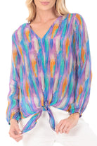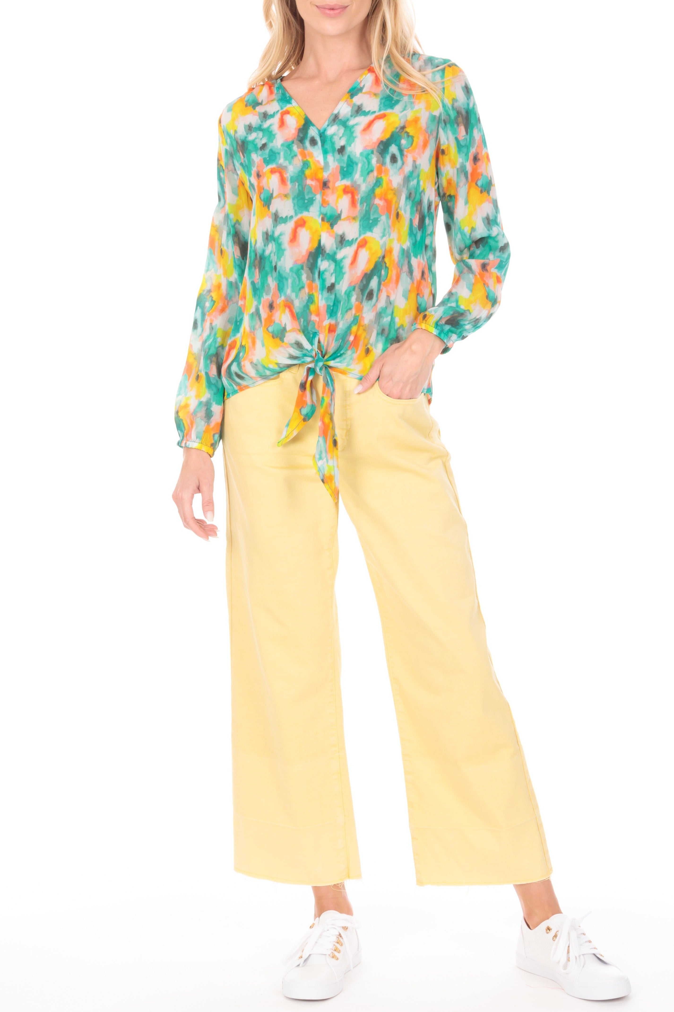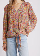 This versatile tie-front creates visual interest with our beautiful prints that draw interest to the front closure. The button down look and V-neck help create a flattering silhouette. This top is a timeless piece that will look chic with a pair of skinny jeans, but you can also dress it down with shorts.