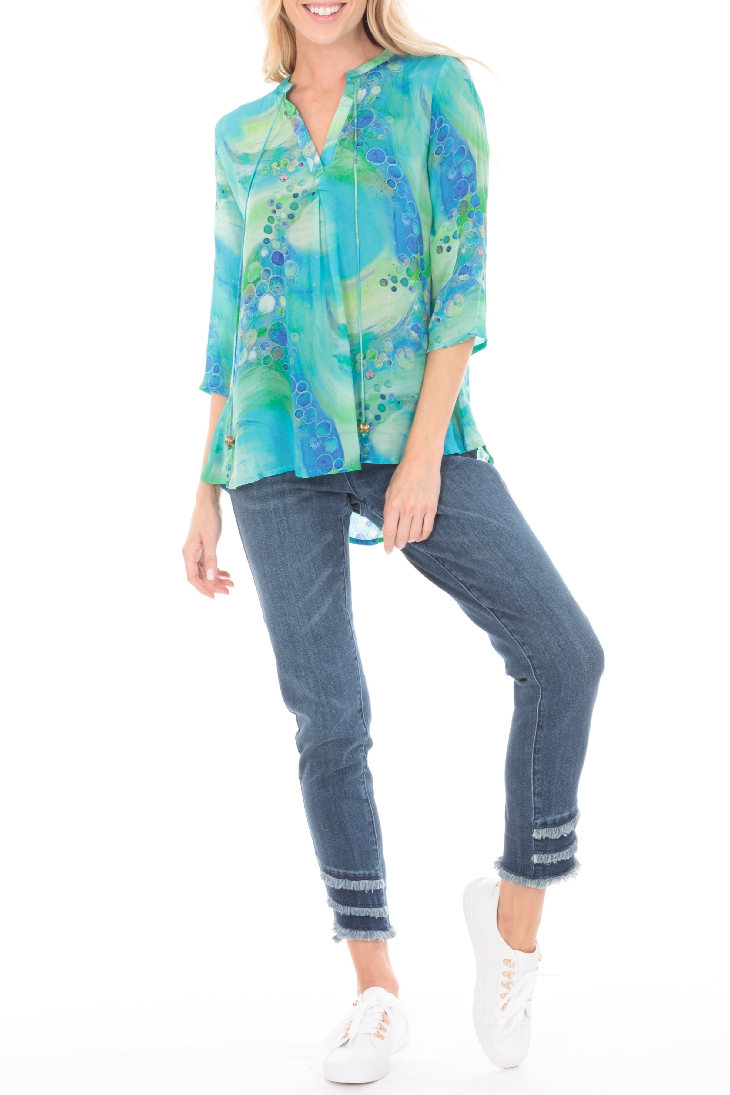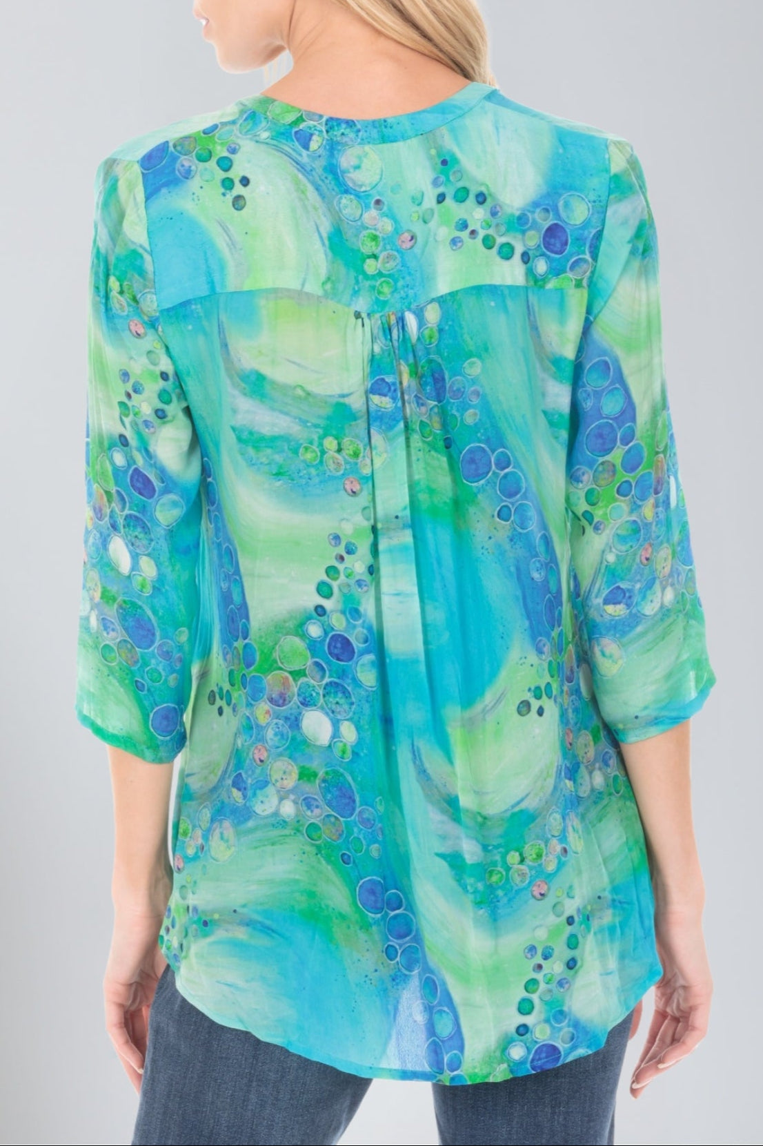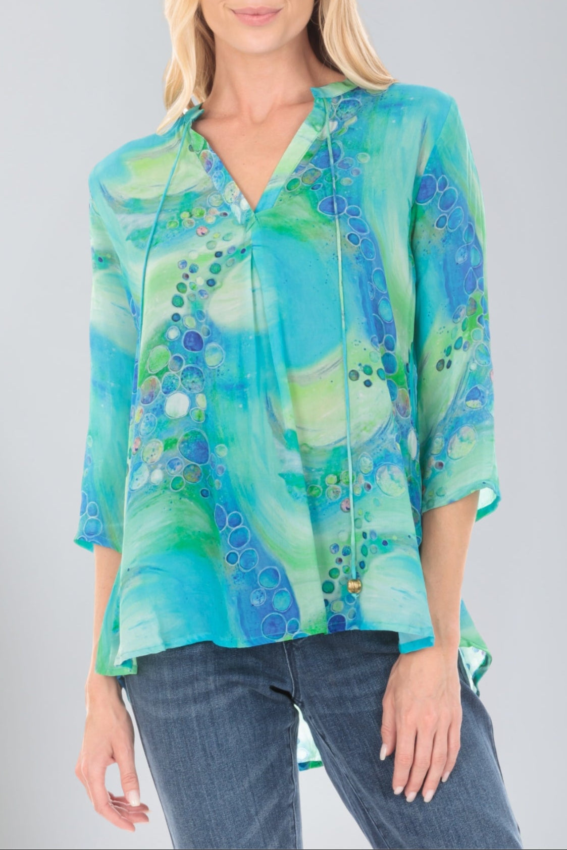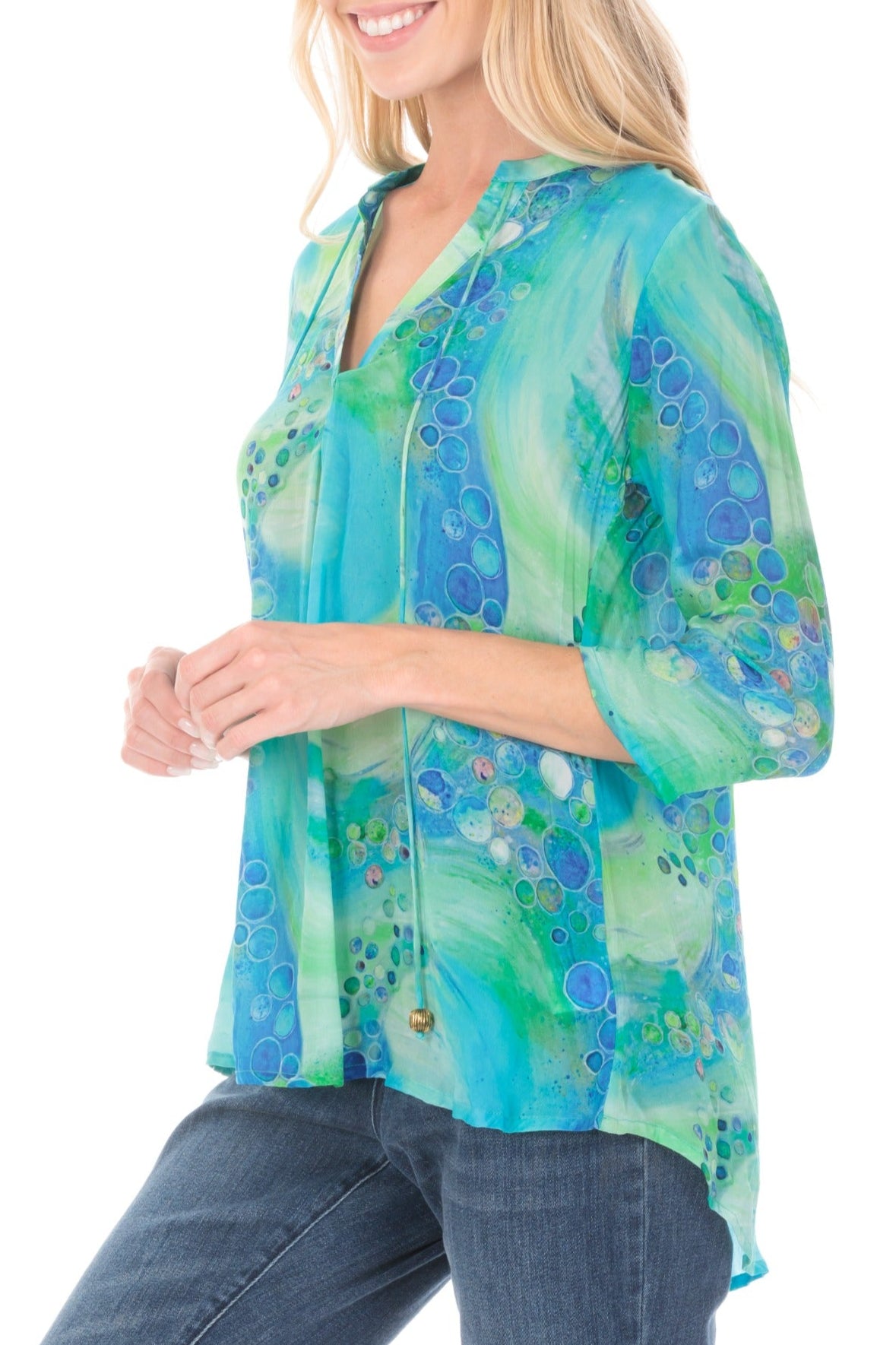 A beautiful silhouette created by a v-neck, and ornate tassels makes this style our top selling blouse. This top is effortlessly stunning, with splendid print pattern splayed across the flowy sleeves and high-low hem. Pair it with fitted denim jeans, strappy sandals or heels, and gold or silver jewelry for a gorgeous ensemble that you'll want to wear all year long.