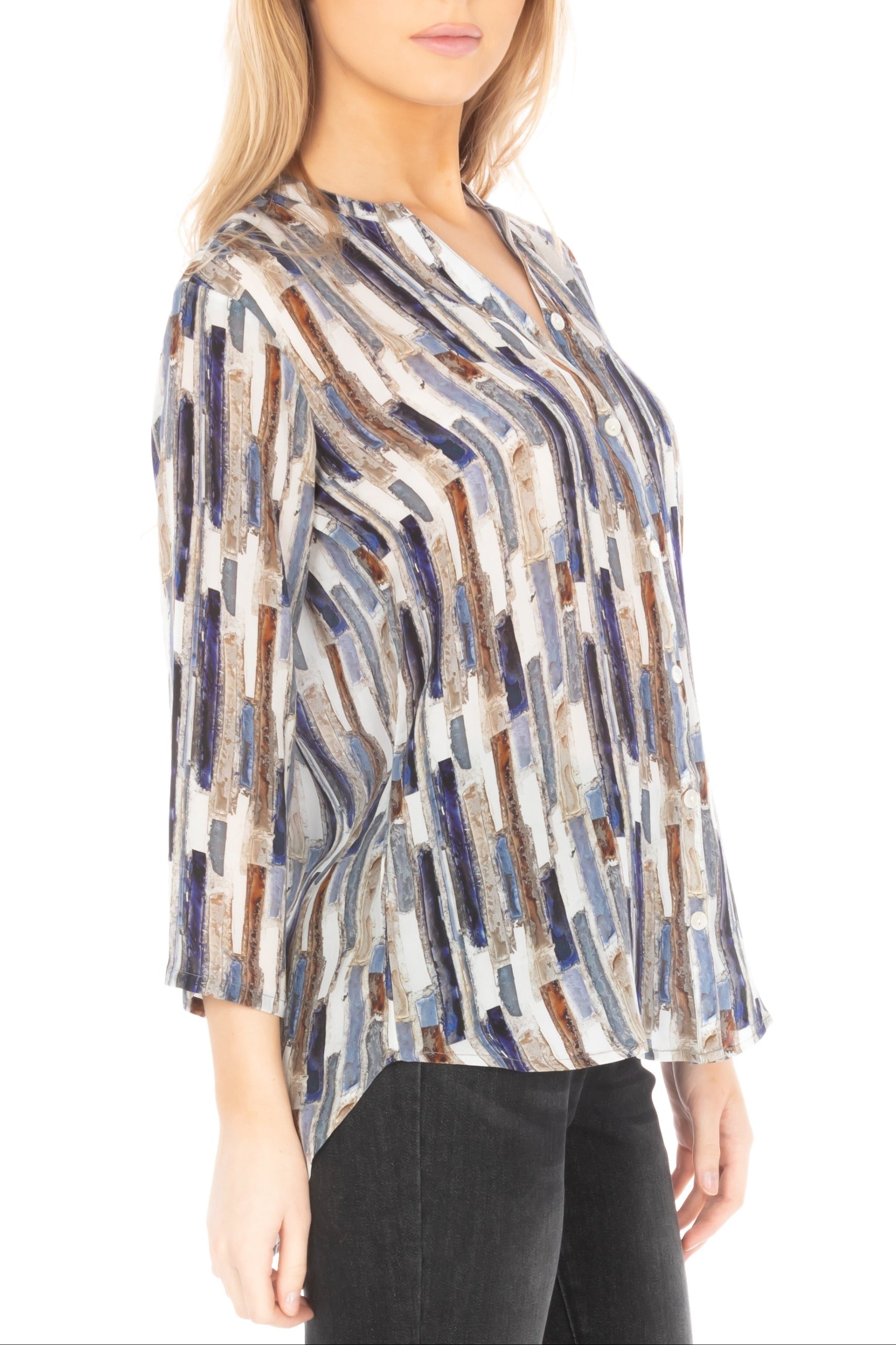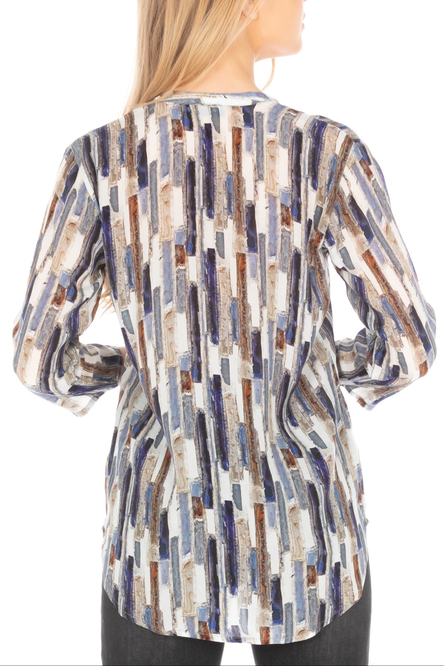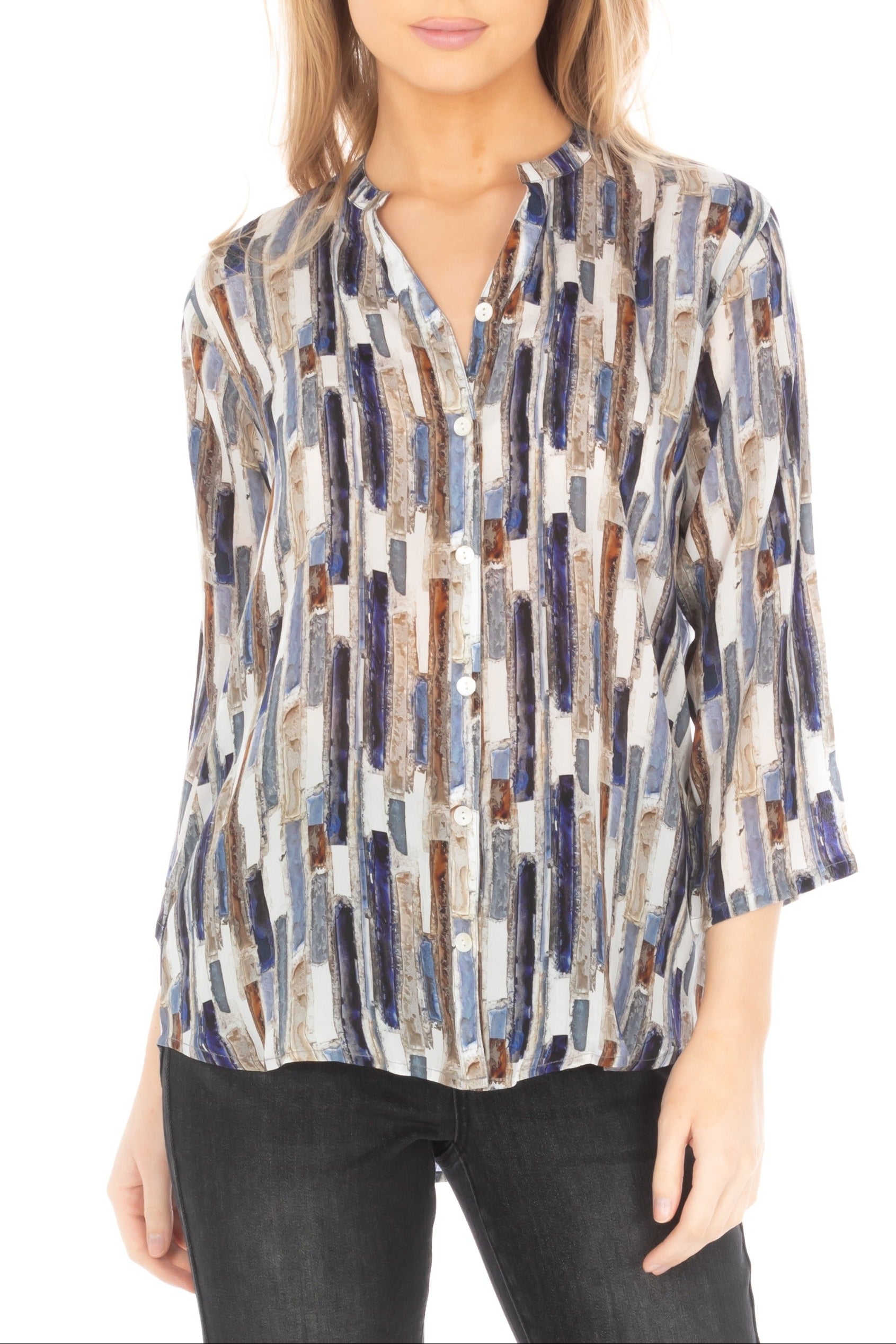 Our 3/4 Sleeve Mandarin Collar Button-Up feels like an artistic work of art—it is a true blend between traditional and modern fashion. The trim mandarin neckline strikes an unassumingly sober tone, while the flowing three-quarter sleeves convey an aura of refined poise, refreshing your overall appearance.