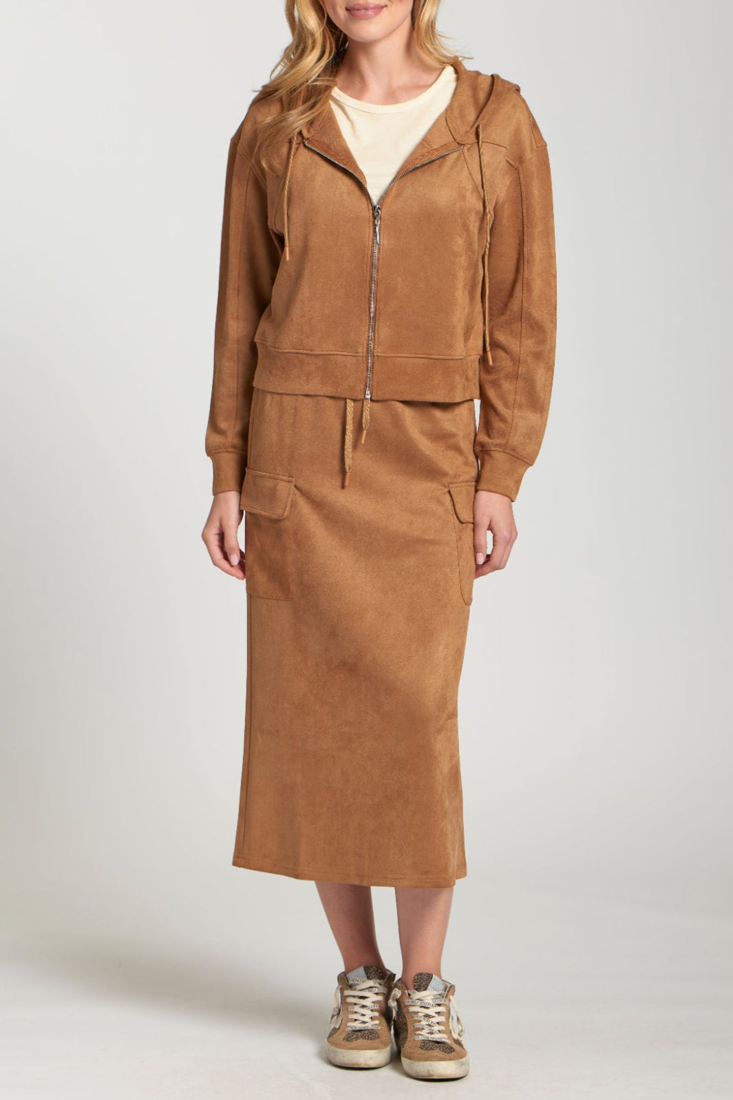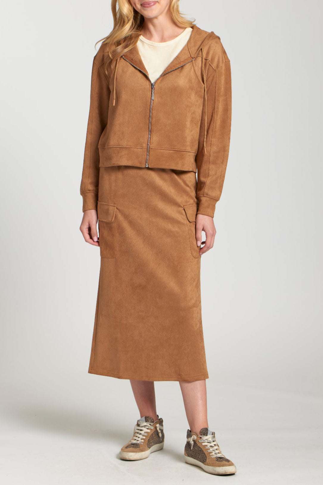 Elevate your casual wear with this chic Vegan Suede Zip-Front Hooded Jacket. Crafted from luxuriously soft faux suede in a rich caramel hue, this cropped jacket offers a stylish blend of comfort and modern design. It features a full zip front, a cozy hood with an adjustable drawstring, and a comfortable elasticated hem and cuffs for a perfect fit. Ideal for layering over your favorite tees or dresses, this jacket provides an effortlessly cool finish to any outfit while offering the sophisticated texture of suede in an ethical and easy-care material.