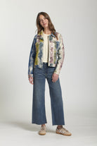 The Silver Chevron Printed Wide Leg Crop Jean blends contemporary style with everyday comfort. Featuring a striking metallic chevron print, a flattering wide-leg silhouette, and a cropped length, these jeans add a touch of modern glamour. Perfect for pairing with anything from sleek blouses to casual tees.