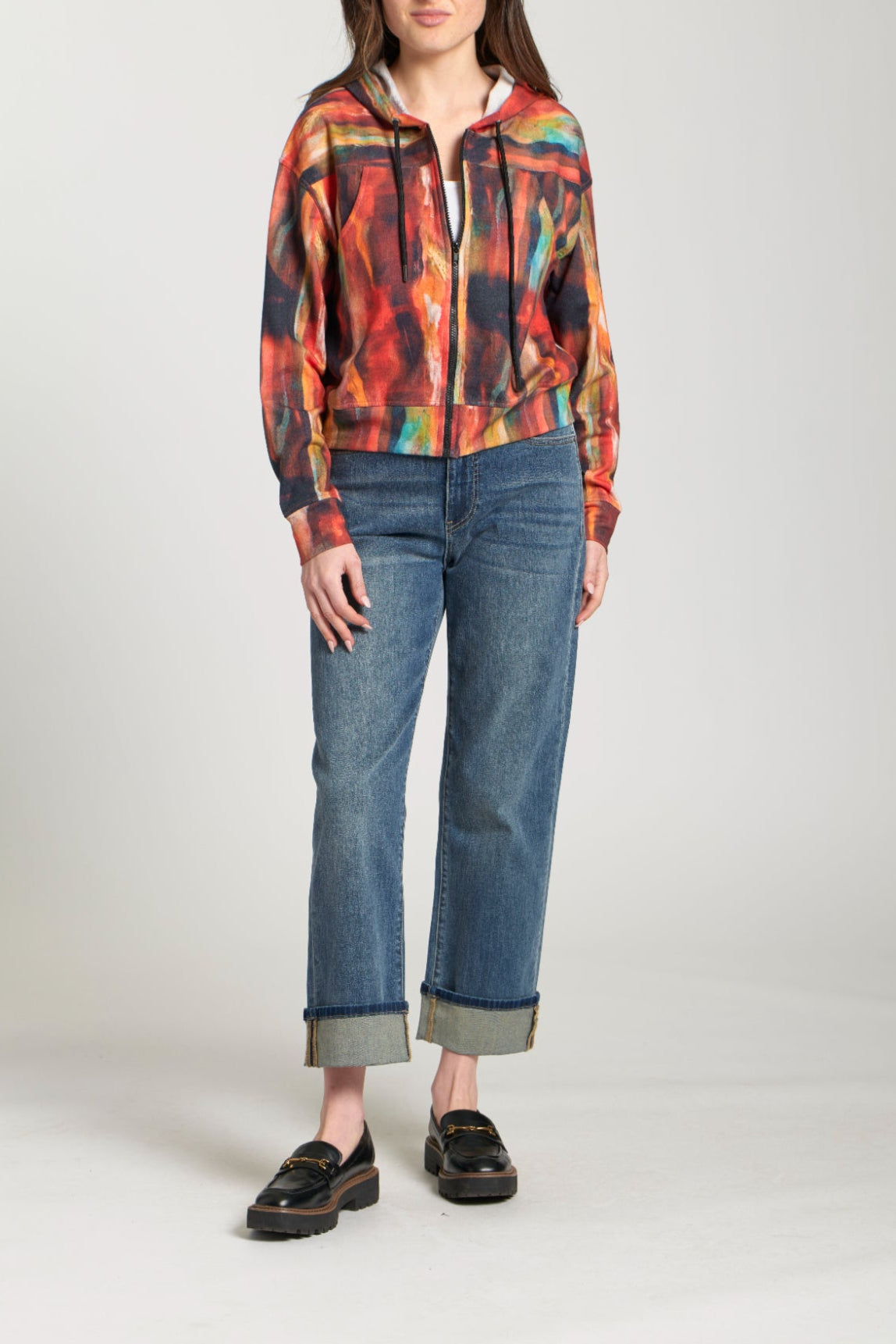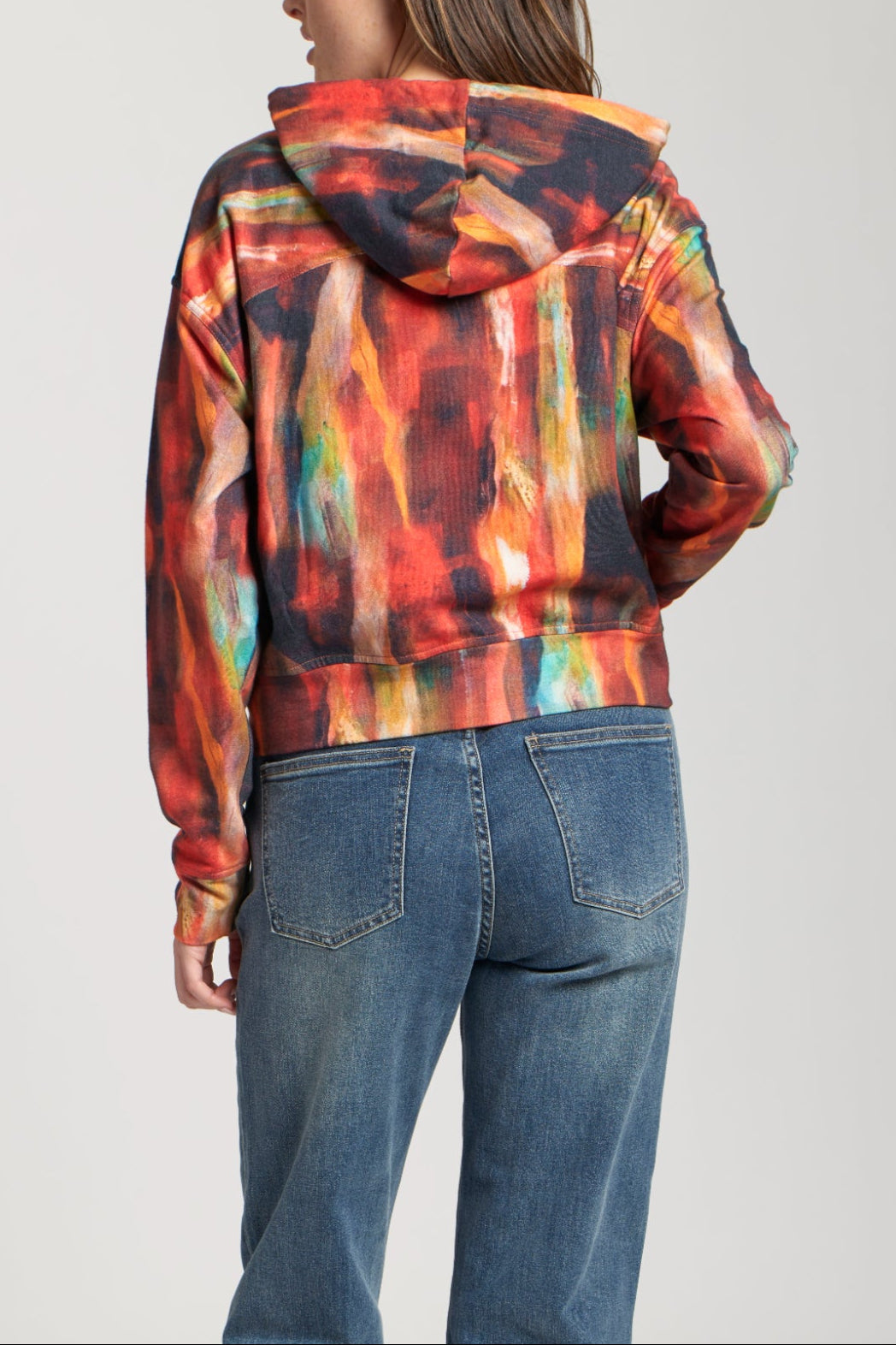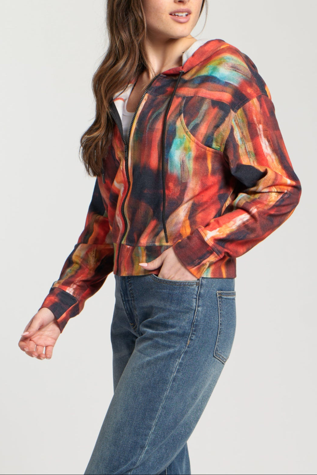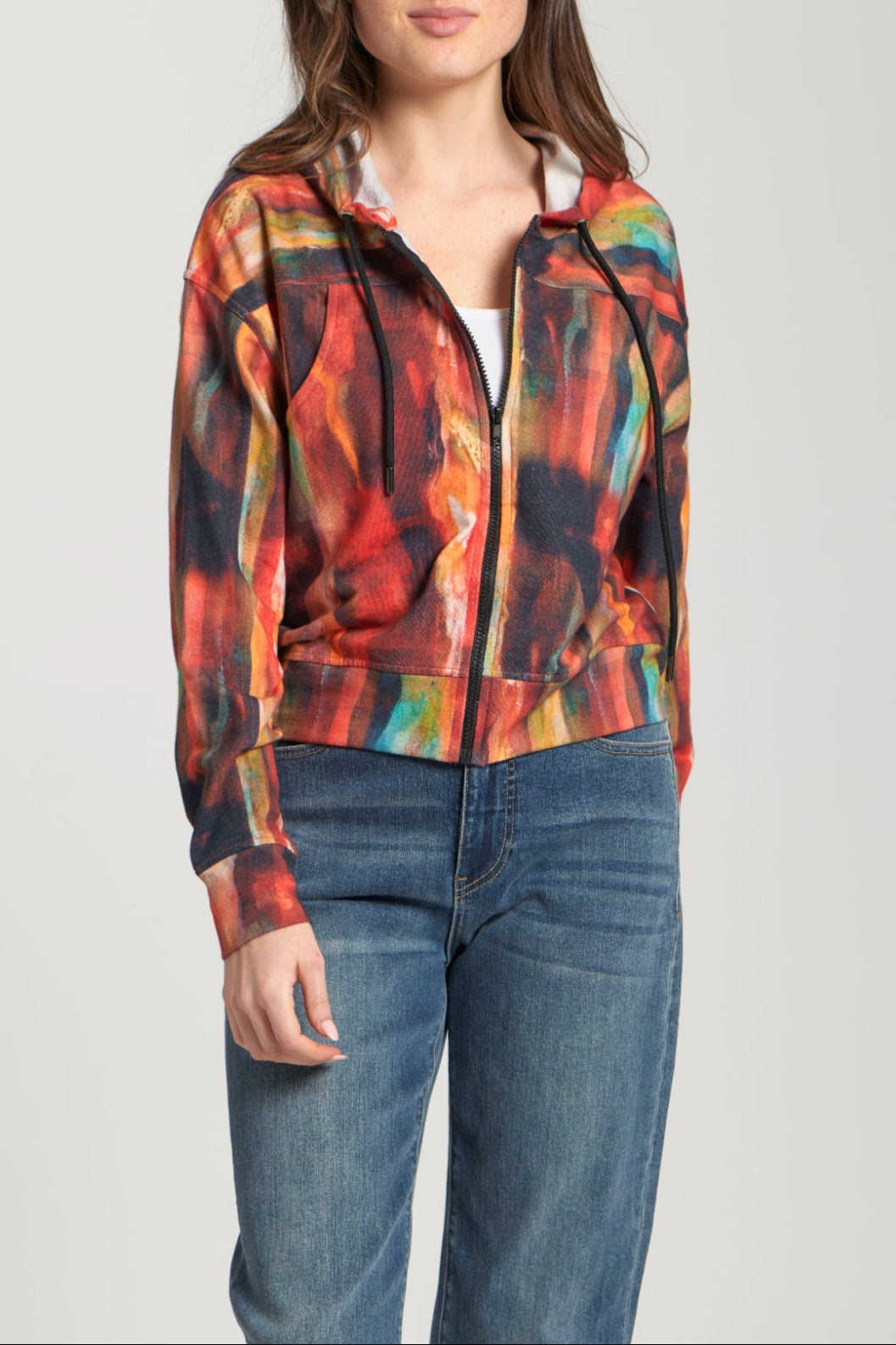 Make a vibrant statement with this striking Abstract Print Zip Front Hoodie, a colorful update to your essential casual wear. This hooded jacket features a bold multi-color motif that resembles an artistic, painterly streak across the fabric. Designed for comfort and convenience, it has a functional full zip-front closure and an adjustable drawstring hood. The relaxed, slightly cropped fit and soft fabric make it an ideal layering piece to throw on over a simple tee and jeans for an instantly stylish, comfortable look.